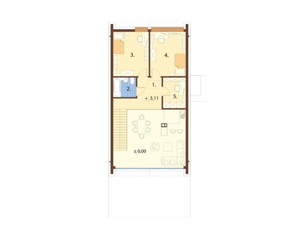 Z salonu można wyjść na taras i ogród, a także przejść na antresolę. Obok schodów na poddasze jest WC, a za nim pomieszczenie w którym jest kotłownia i pralnia. Ponadto wiatrołap, sypialnia z prywatną łazienką i garderobą.