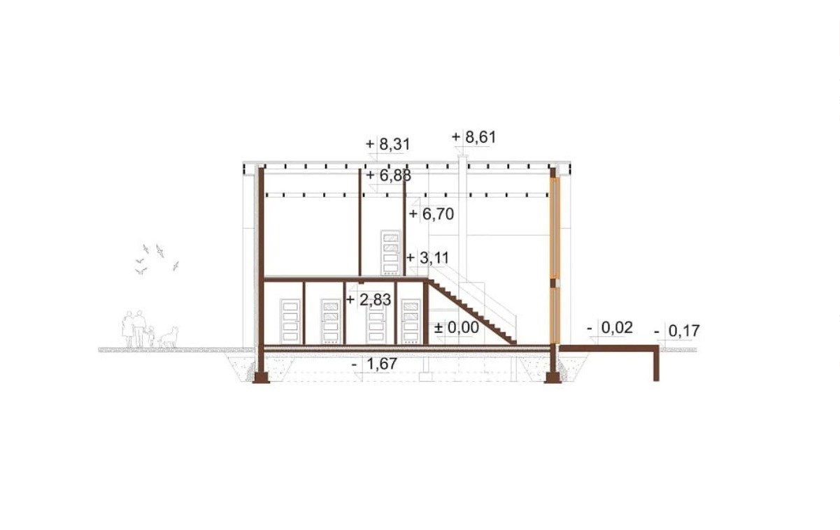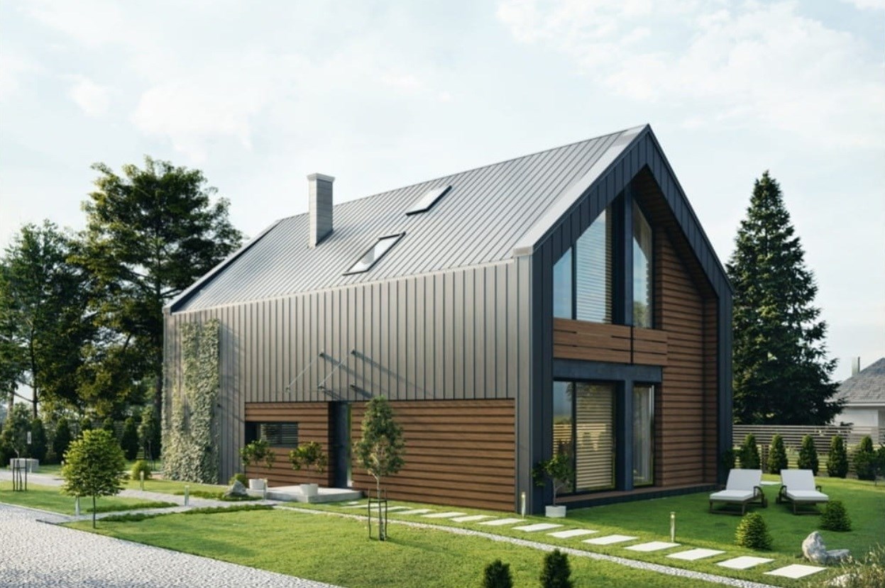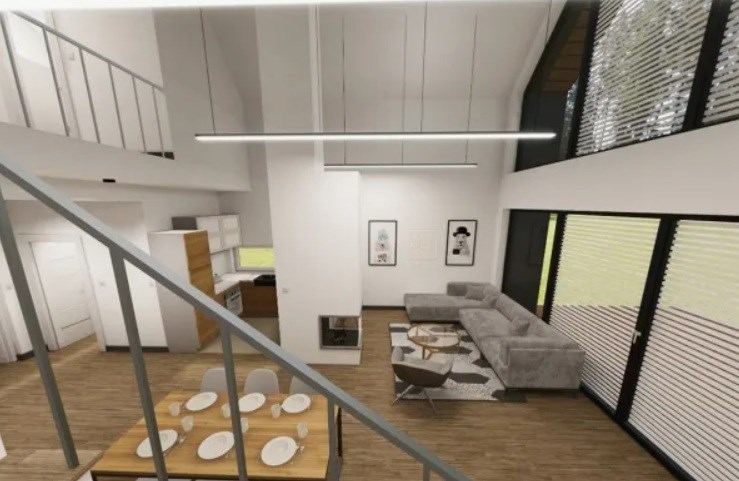 Ergonomiczny dom, zaprojektowany z myślą o praktycznych aspektach użytkowania, utrzymany w stylistyce nowoczesnej stodoły. Posiada duże przeszklenia w elewacjach bocznych, co sprawia że jest bardzo słoneczny i przytulny. Przeszklenia wraz z tarasem i ogrodem od strony południowo-zachodniej, widok na pola i lasy dzięki braku sąsiadujących działek budowlanych, dla osób ceniących prywatność.