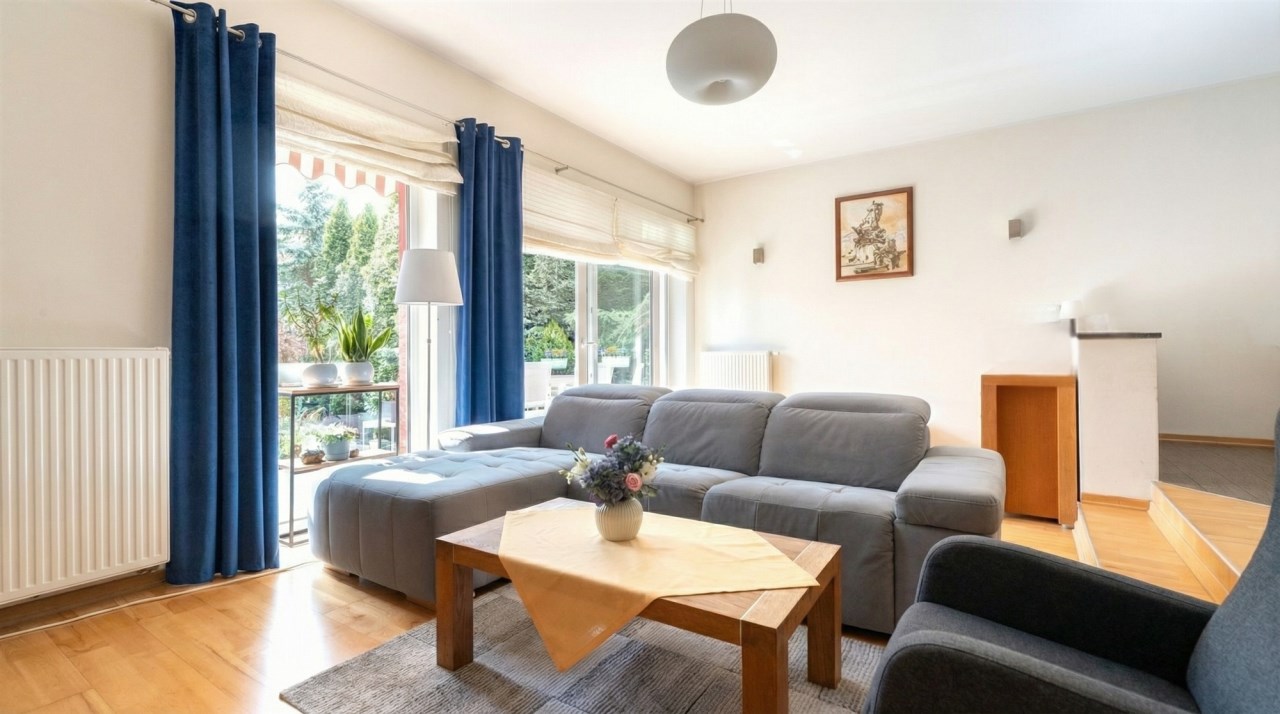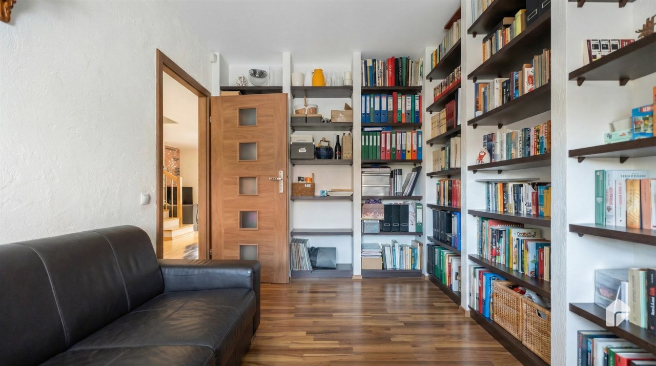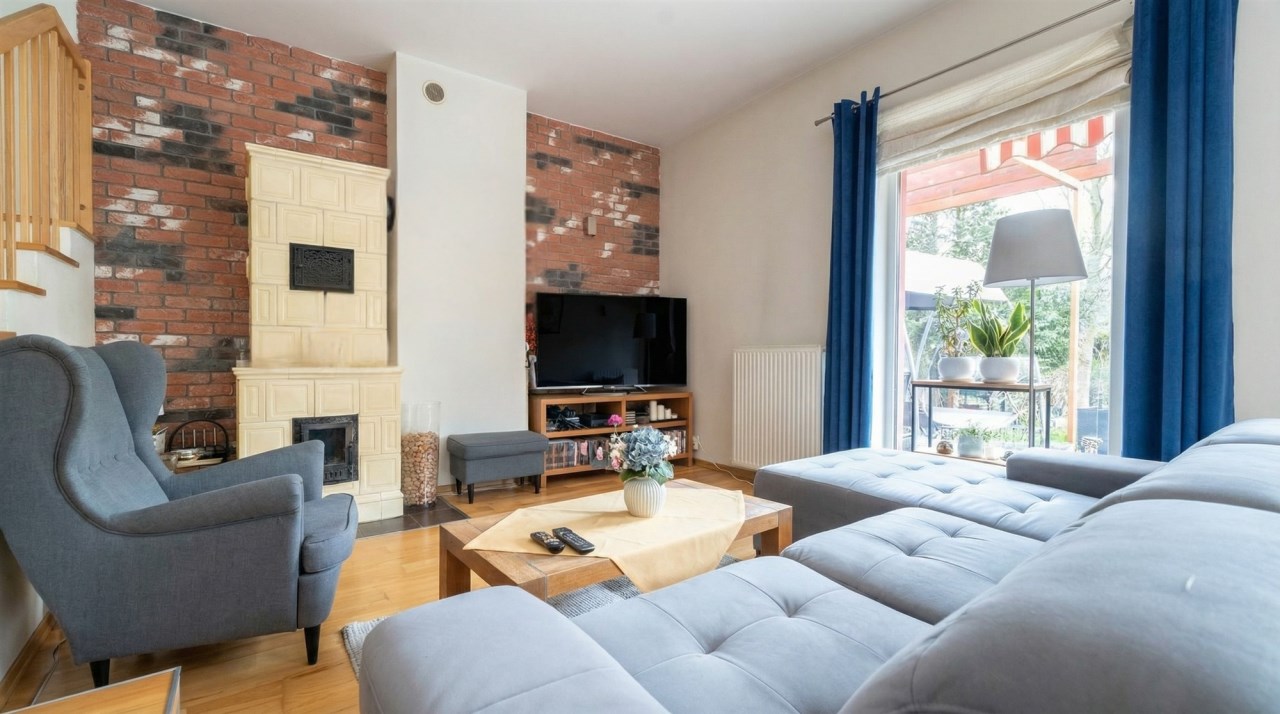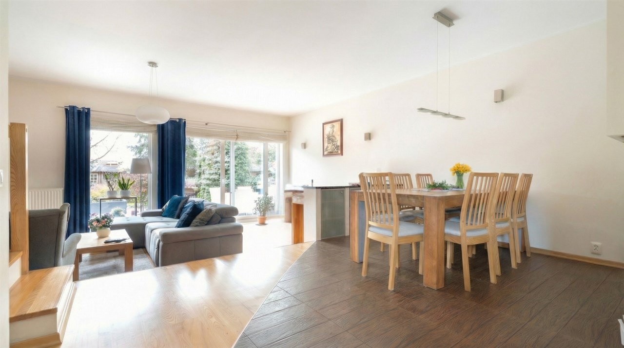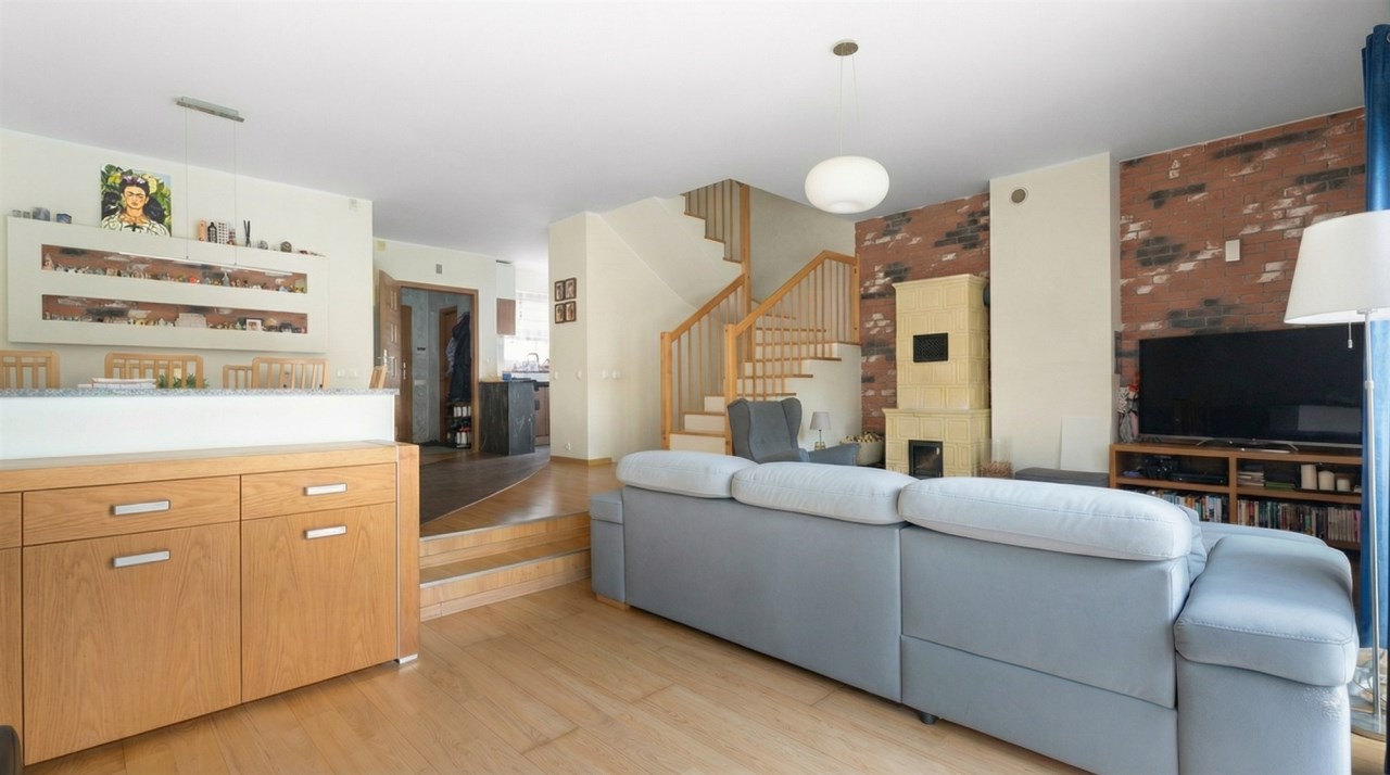 Parter to duży salon z otwartą kuchnia, podzielony na dwie strefy. Strefę kuchenno -jadalnianą i wypoczynkową. Kuchnia z oknem w jasnej zabudowie , w jadalni duży stół z krzesłami. Strefa wypoczynkowa z panoramicznymi przesuwnymi oknami skąd jest wyjście na duży taras i słoneczny ogród. W salonie właściciele , zamiast kominka wstawili piec kaflowy. Na tym poziomie znajduje się pokój (gabinet ) o powierzchni ponad 12 m kw oraz toaleta. Tu też znajdują się schody prowadzące na piętro pierwsze oraz na poziom -1. Piętro pierwsze to trzy sypialnie, garderoba oraz łazienka z oknem i z dużym prysznicem Dzięki usytuowaniu okien, pokoje są dobrze doświetlone a zarazem bardzo ustawne. W dwóch sypialniach balkony. Nad piętrem jest poddasze służące do przechowywania. Poziom -1 to duży garaż o powierzchni ponad 25 m oraz dwa dodatkowe pomieszczenia spełniające funkcje pralni i piwnicy.