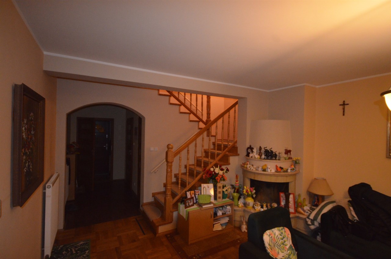 Na parterze salon z kominkiem i wyjściem na taras i do zagospodarowanego ogrodka ,otwarta kuchnia oraz łazienka z wc, przejście do długiego garażu.