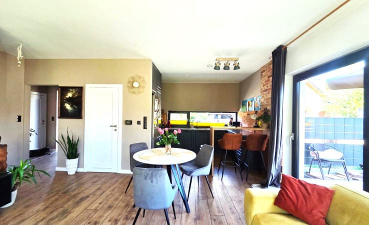 Salon połączony jest z jadalnią, z salonu dwa wyjścia do ogrodu, gdzie znajdują się liczne nasadzenia i idealnie nadaje się na relaksu i spotkań z rodziną oraz przyjaciółmi.