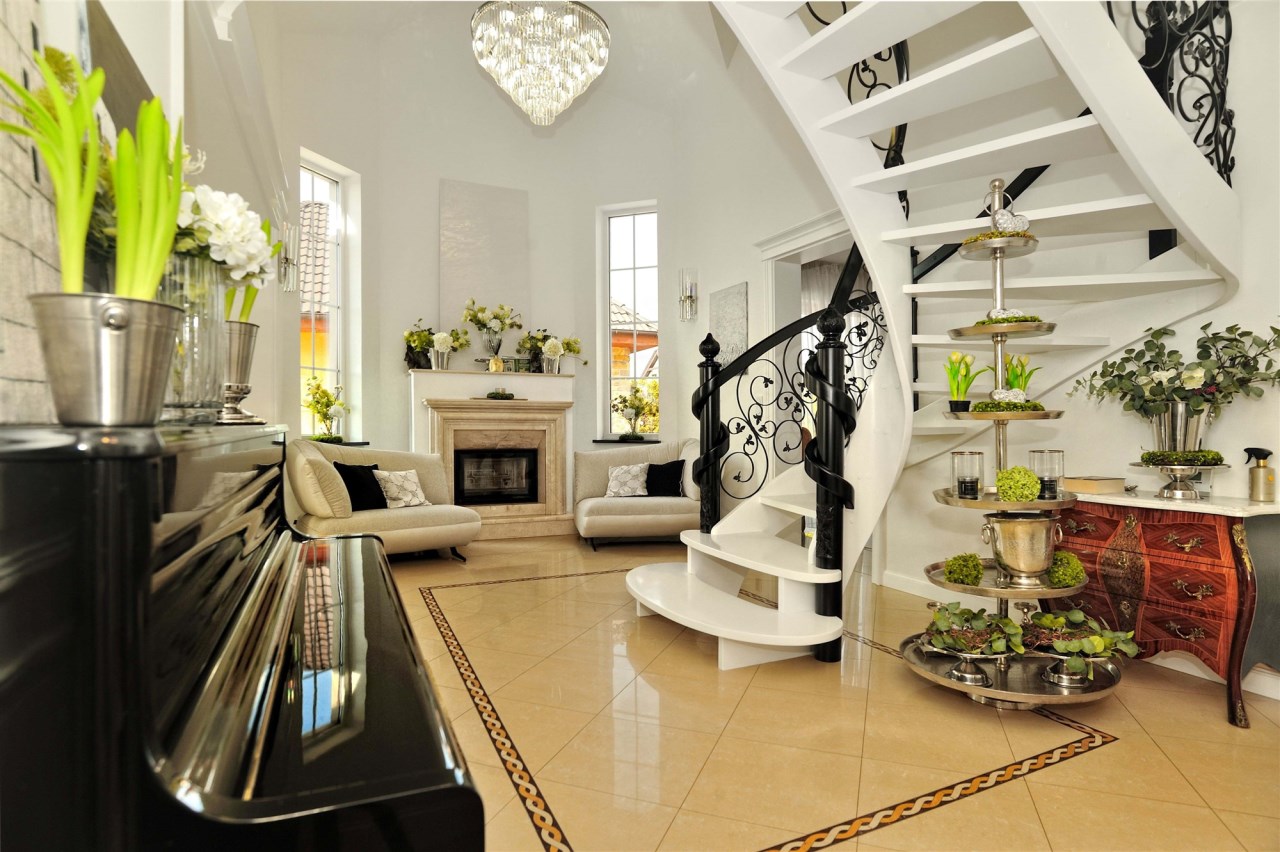 - reprezentacyjny hol – wysokość 7 metrów, marmurowy kominek i eleganckie, kręcone schody