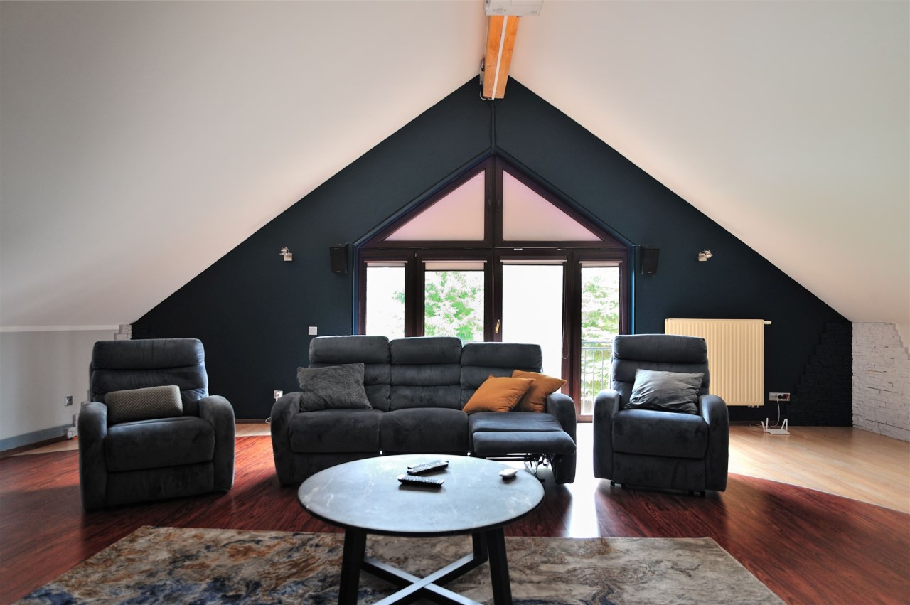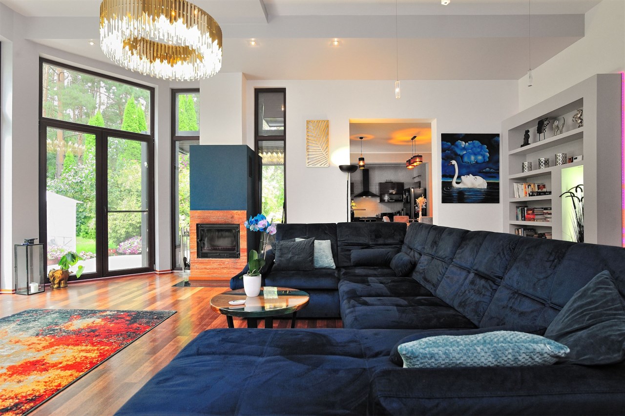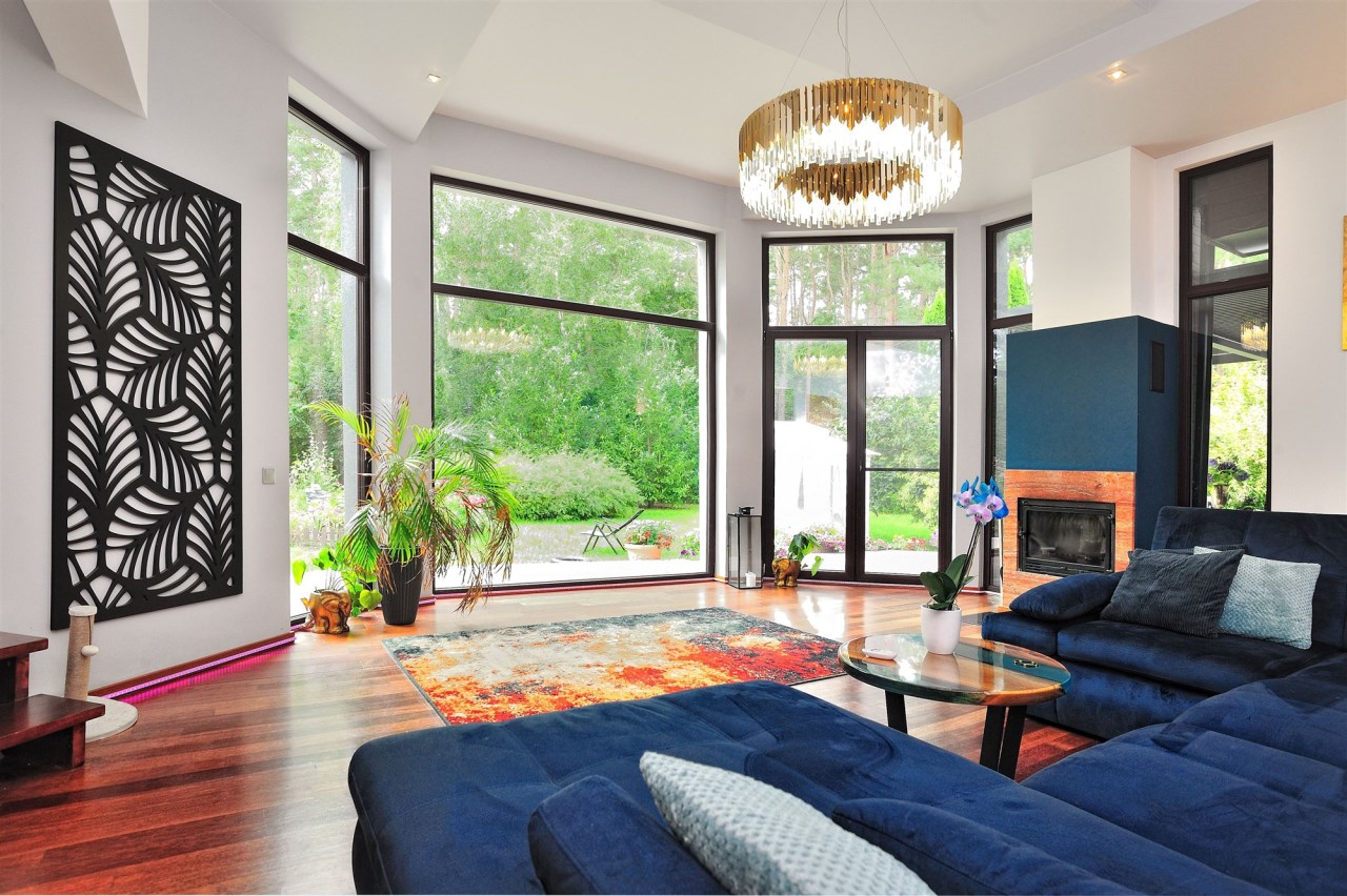 przestronny salon z dużymi przeszkleniami i widokiem na ogród (ok. 40 m²),