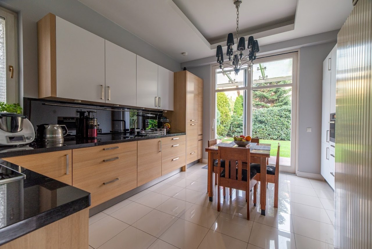 Z kuchni i jadalni można wyjść bezpośrednio na taras z widokiem na ogród — idealne miejsce na poranną kawę lub spotkania z bliskimi.