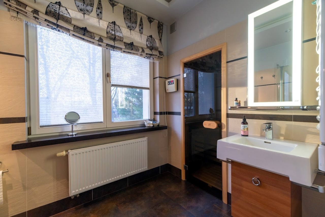 - Sypialnia typu master bedroom (z klimatyzacją) z prywatnym salonem kąpielowym, dużą garderobą i wyjściem na taras,