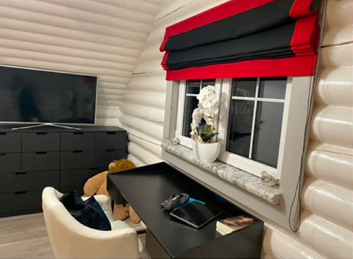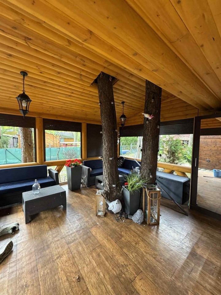 Dom wykonany z naturalnego bala drewnianego tworzy niepowtarzalny klimat – ciepły, przytulny i harmonijnie wpisujący się w otoczenie lasów i jeziora. Duże przeszklenia zapewniają doskonałe doświetlenie wnętrza i widok na zieleń.