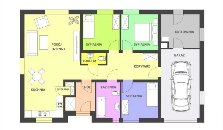Dom wolnostojących o powierzchni użytkowej 132m2 + 100m2 składa się z 3 sypialni, salonu z aneksem kuchennym, łazienki, toalety, garażu oraz kotłowni.