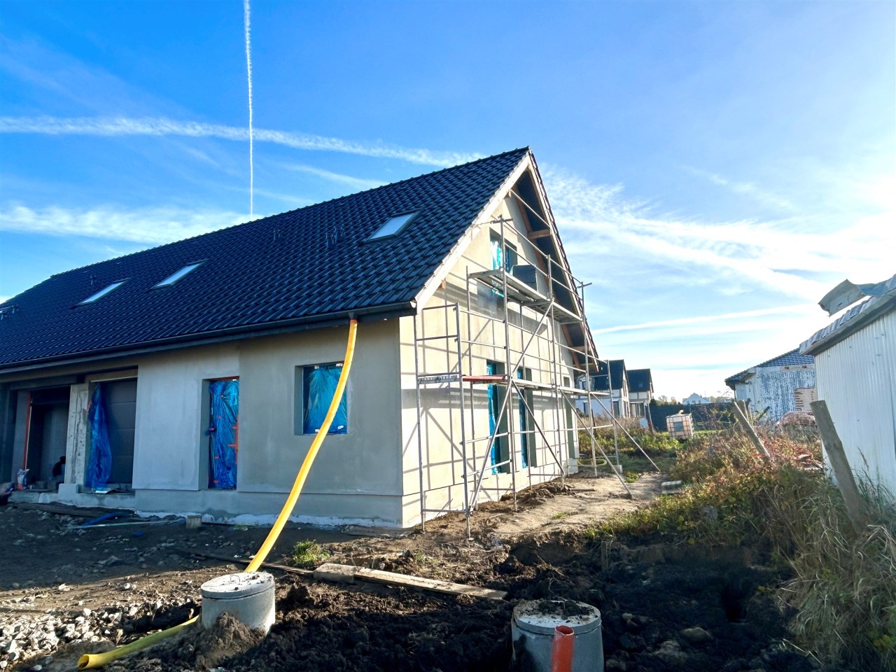 Dom jednorodzinny dwulokalowy w zabudowie bliźniaczej, na na działce 425 m2, o powierzchni użytkowej 130m2 powierzchni użytkowej. W projekcie podwójna ściana z dylatacją między sąsiadami co jest wymagane w zabudowie bliźniaczej a czego nikt z deweloperów nie stosuje w przypadku budynków dwulokalowych. Dostępne media: prąd, woda z wodociągu miejskiego, pompa ciepła, szambo. Budynki w stanie deweloperskim z elewacją i mediami doprowadzonymi do budynku. Budynki w tracie wykańczania, do wydania w I kwartale 2026 roku
