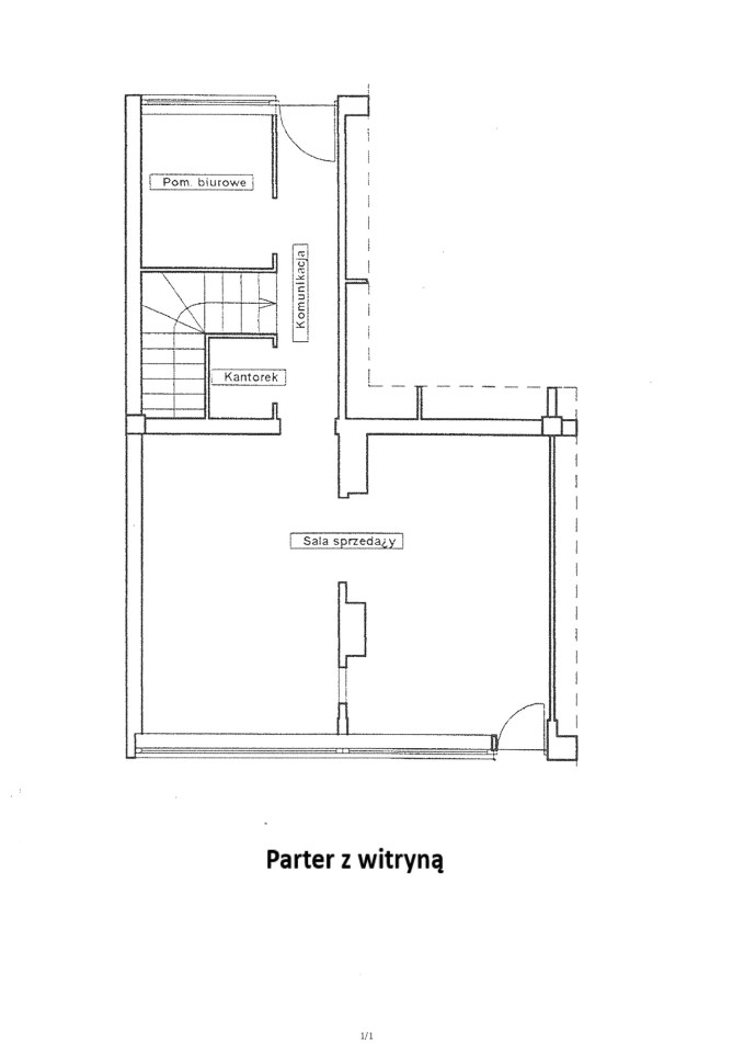 Parter: sala główna z witryną, biuro oraz kantorek. Łączna powierzchnia parteru 48,70 m2.