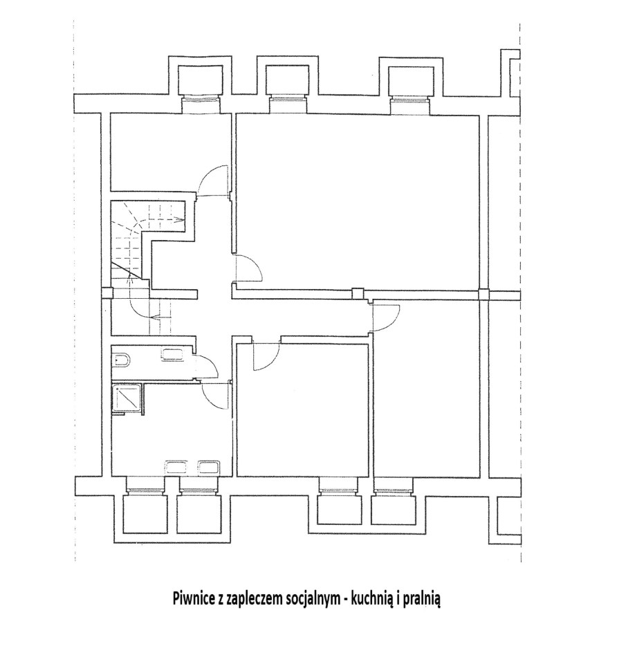Piwnica: cztery pomieszczenia magazynowe, zaplecze socjalne z kuchnią i pralnią oraz wc. Łączna powierzchnia piwnic 81,30 m2.