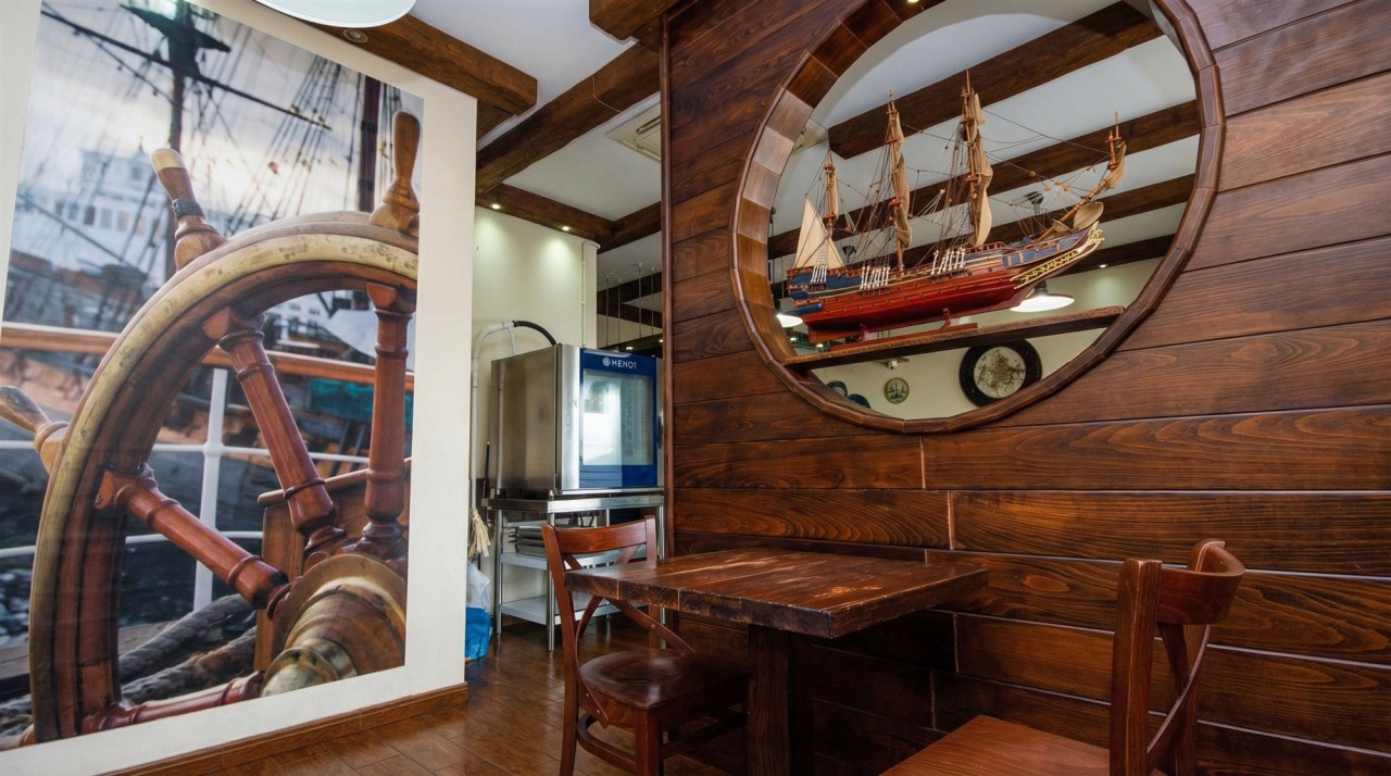 Tawerna wykończona została w nadmorskim stylu, z dominującymi elementami drewna w odcieniach ciemnego koloru, które podkreślają żeglarski klimat wnętrza i tworzą spójną, ciepłą atmosferę. Restauracja może jednocześnie przyjąć około 30 gości, a w sezonie letnim dodatkowe 8 miejsc dostępnych jest w ogródku zewnętrznym.