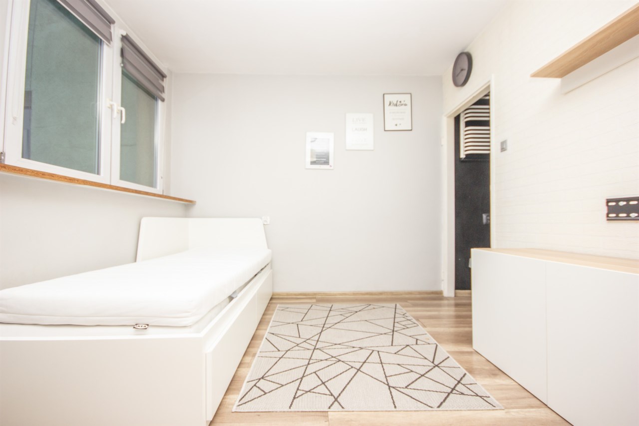 - jednego pokoju z duża szafą, łóżkiem i miejscem do jedzenia