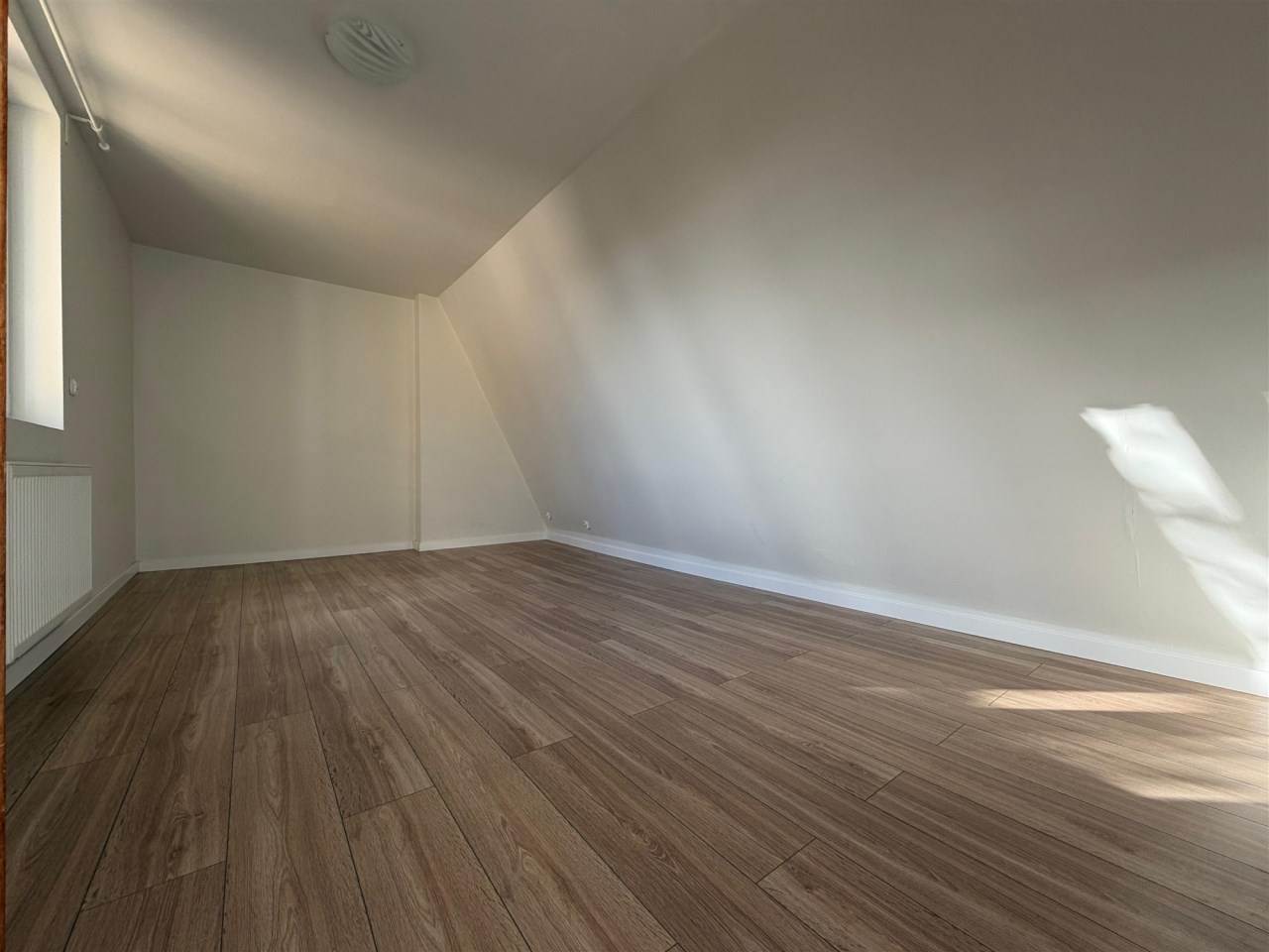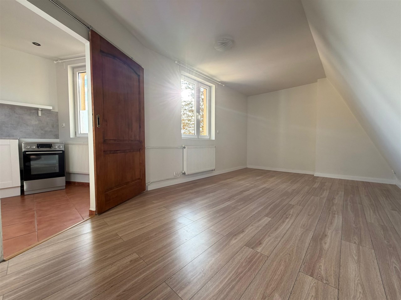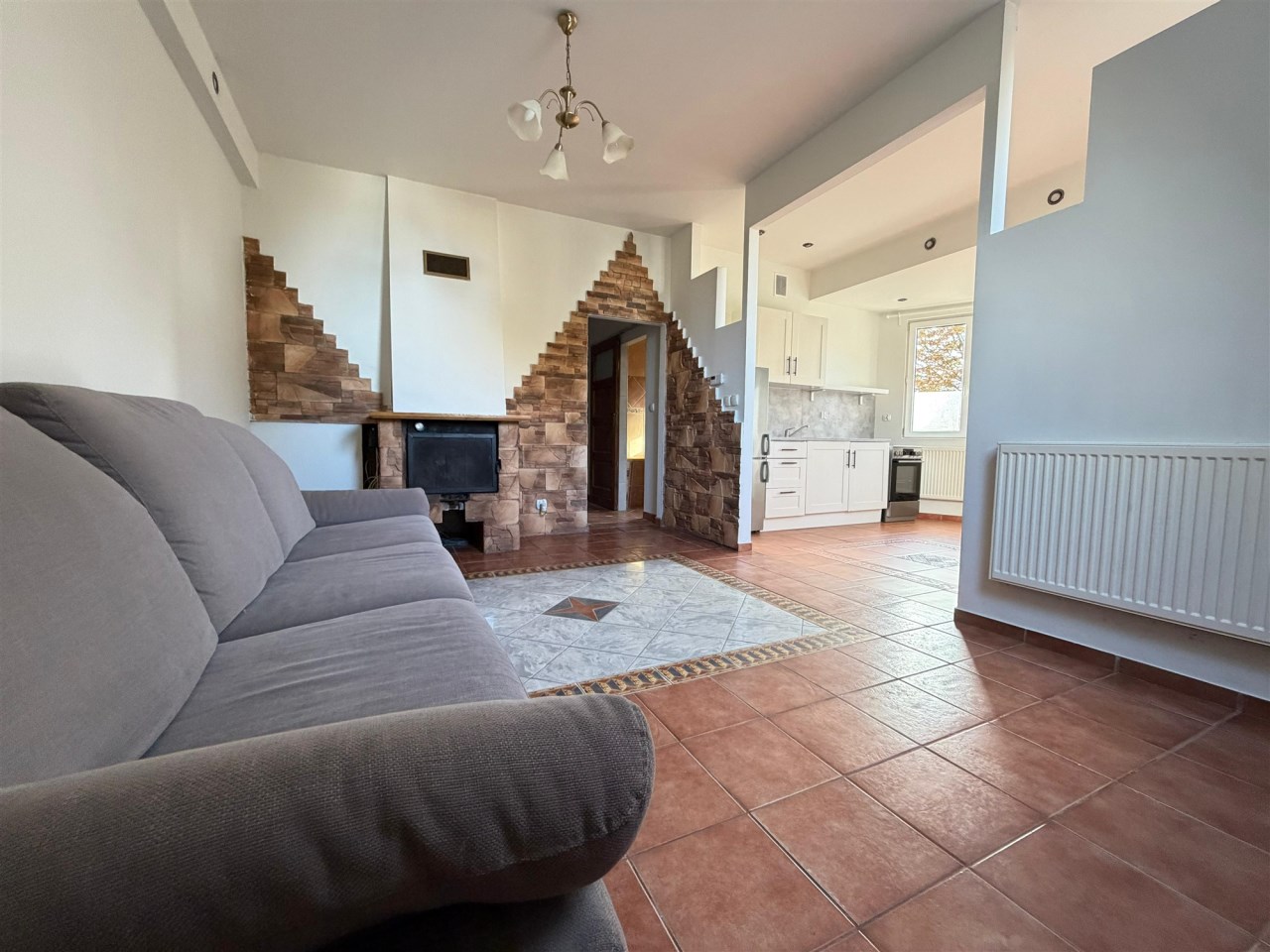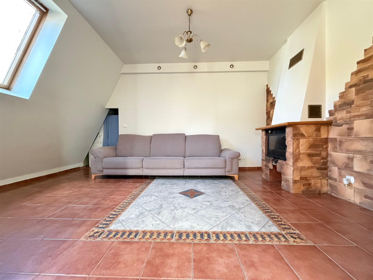 - salon z kominkiem i schowkiem pod skosem