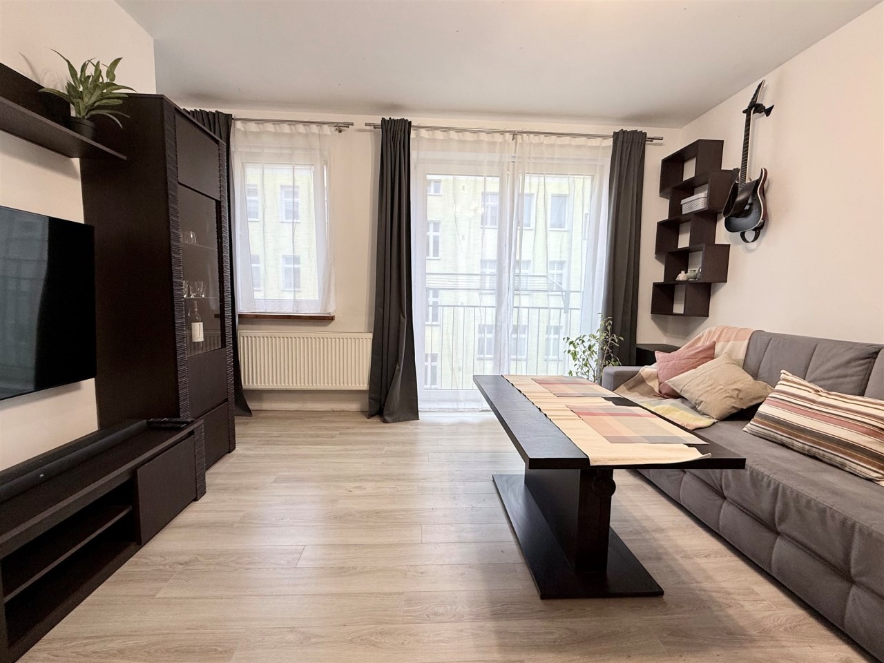 przestronny salon z kratką balkonową
