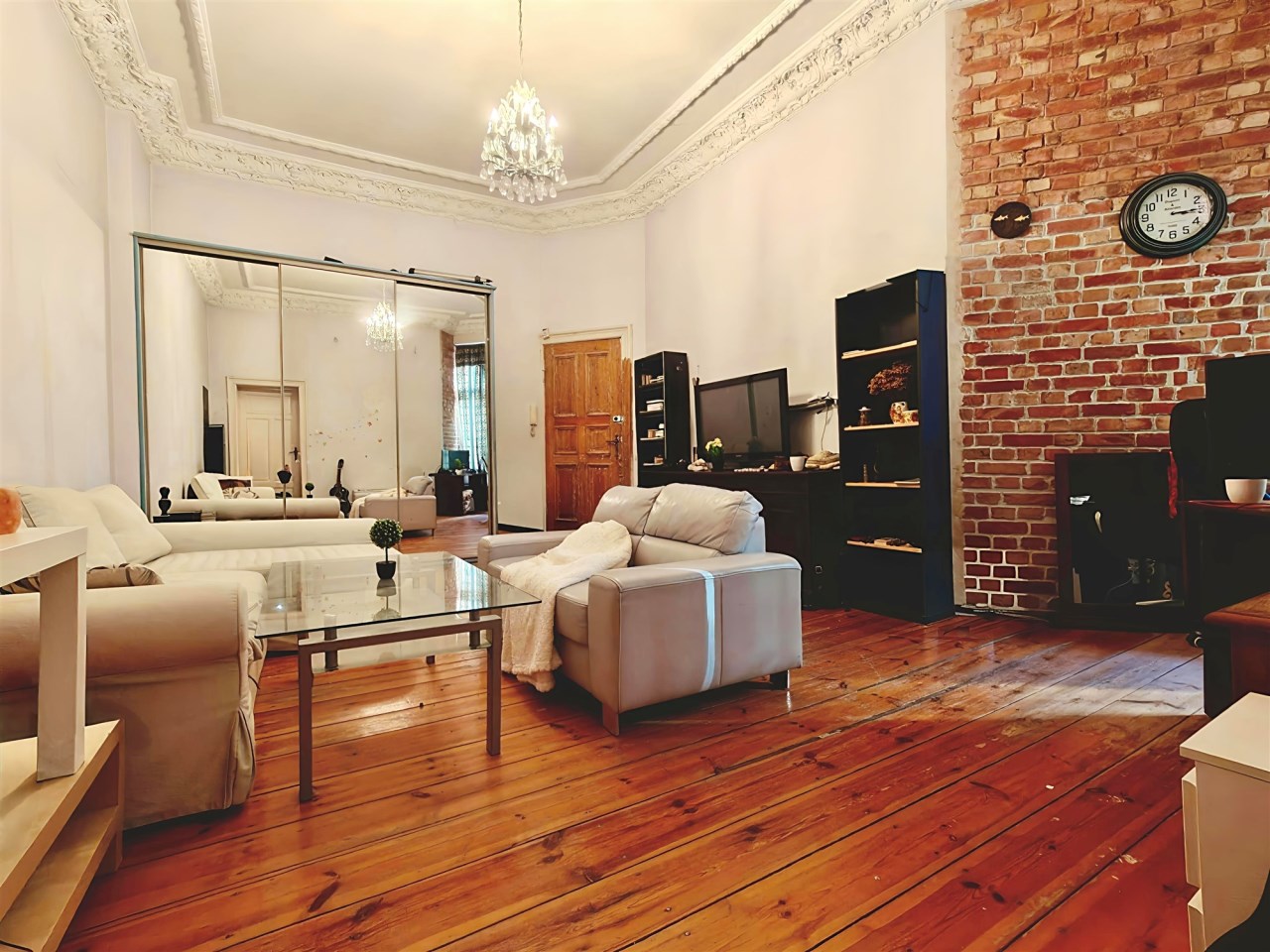 Nieruchomość usytuowana jest na pierwszym piętrze w 4-piętrowej, klasycznej kamienicy z cegły. Posiada nieszablonowy układ - wejście do mieszkania odbywa się przez korytarz współdzielony z sąsiadką. Zaraz po wejściu trafiamy do nastrojowego, wysokiego salonu, z którego przechodzimy do kuchni połączonej z łazienką. Idąc dalej, docieramy do drugiego słonecznego pokoju. Do mieszkania przynależy piwnica.