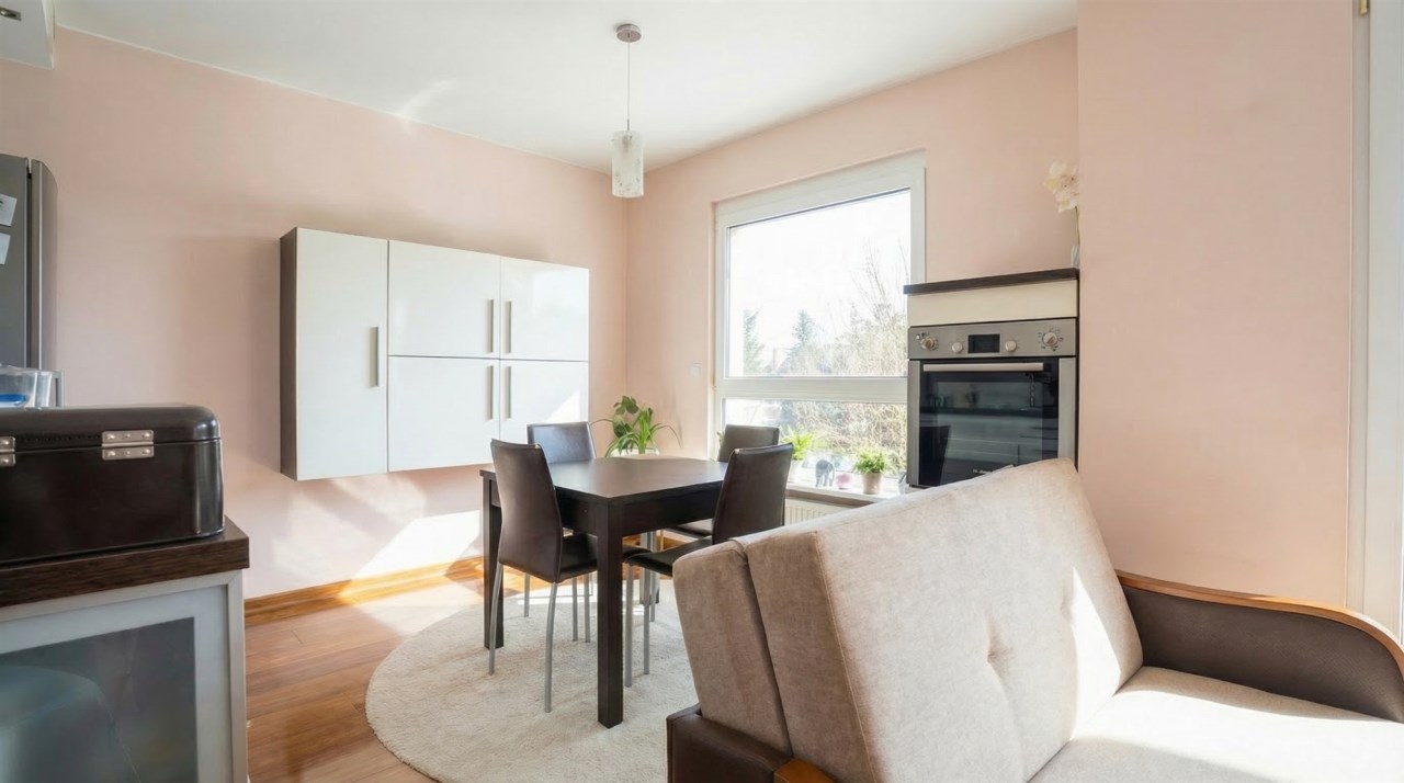 Salon podzielony na dwie strefy, kuchnia z jadalnią oraz strefa wypoczynkowa. Z salonu wyjście na słoneczny balkon z ładnym widokiem na wille.