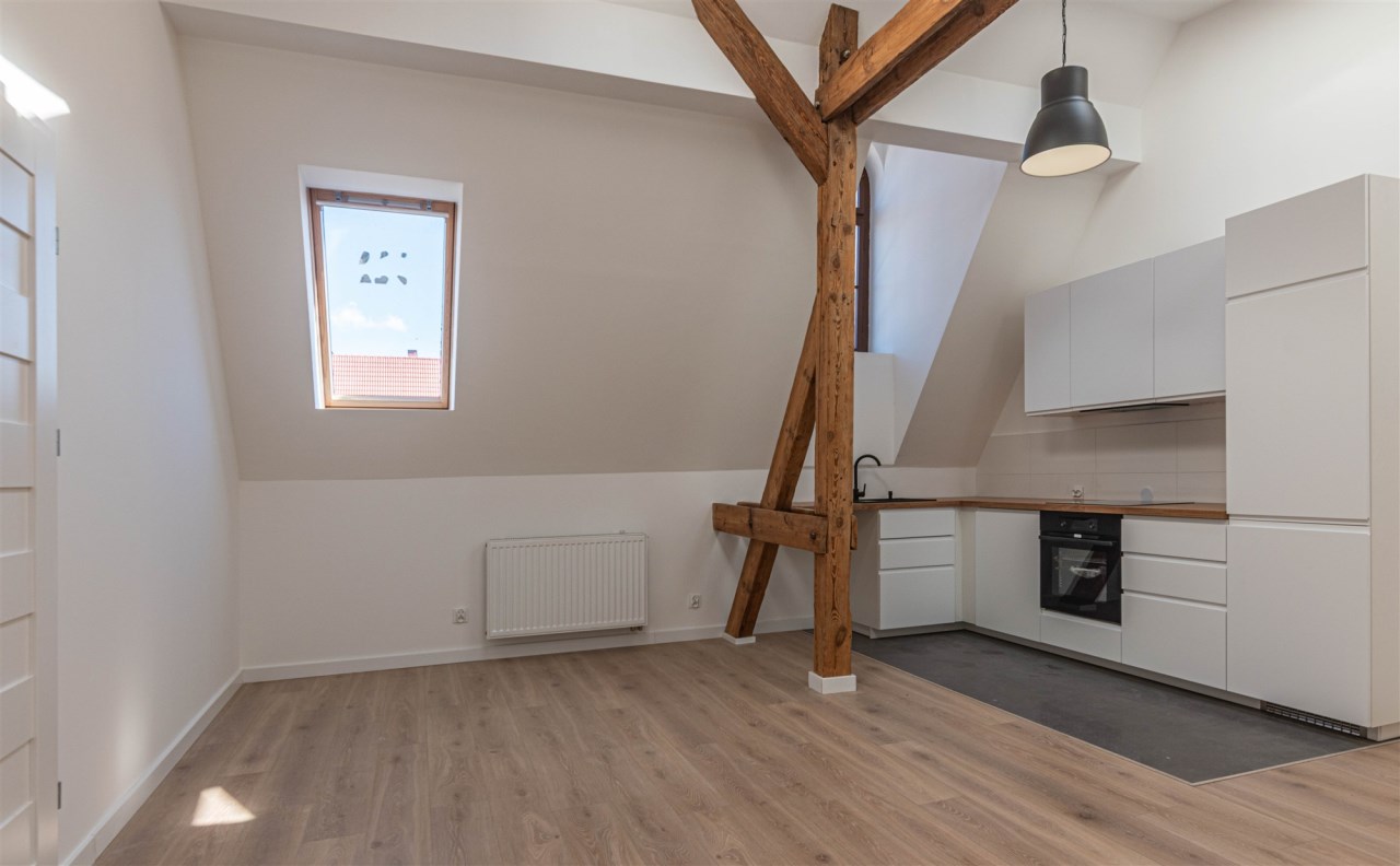 Adaptacja poddasza. Mieszkanie w bardzo dobrym standardzie, zaaranżowany w nowoczesnym stylu - salon otwarty na przedpokój, połączony z aneksem kuchennym, duża sypialnia. Łazienka połączona z wc. Ekspozycja okien jednostronna, północno wschodnia.