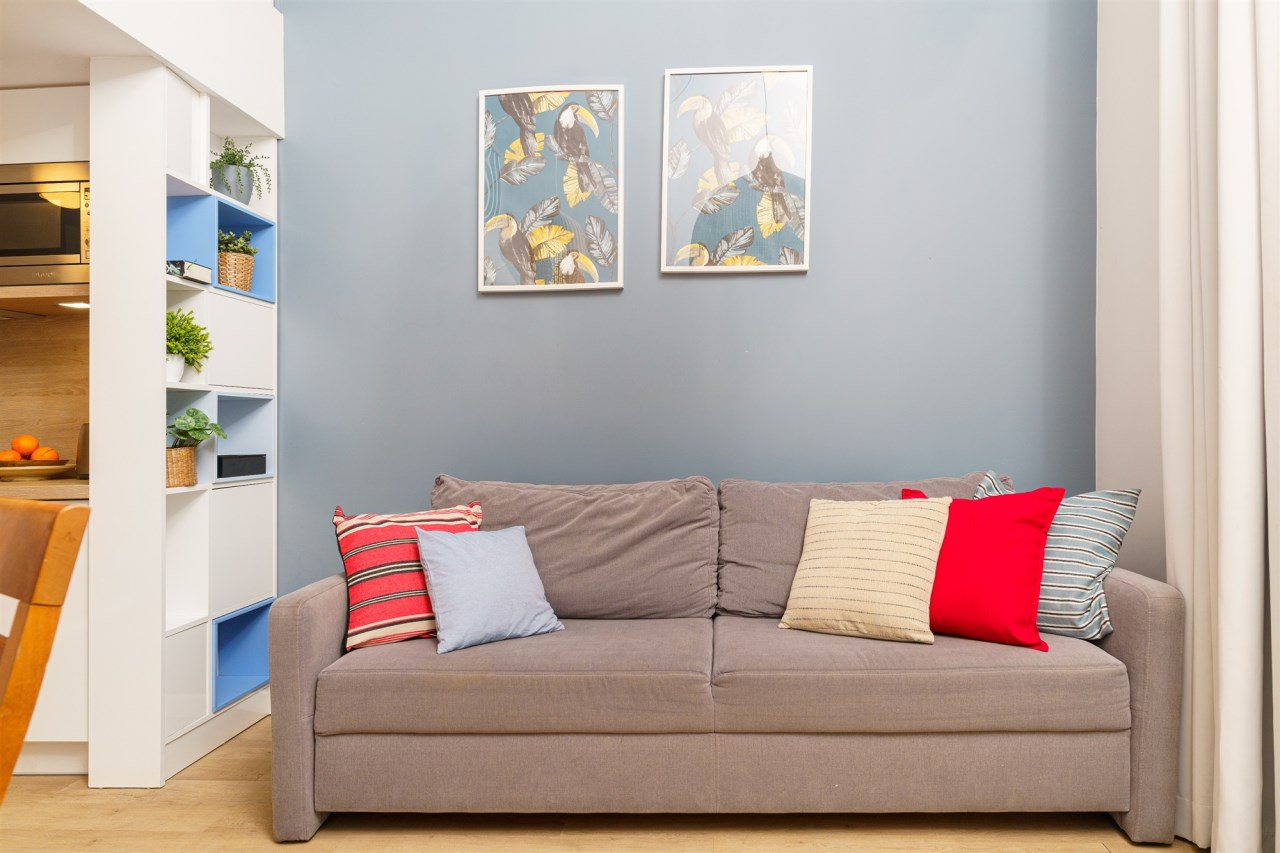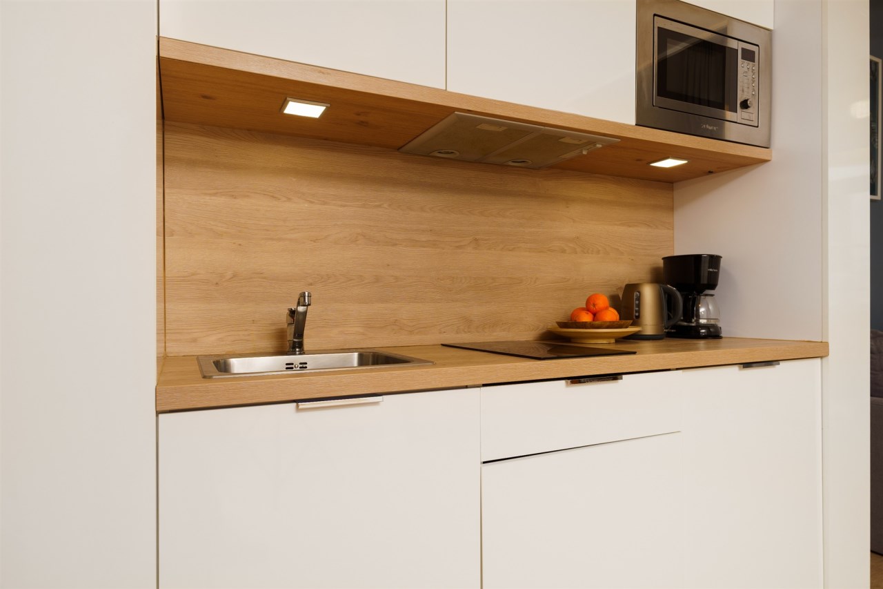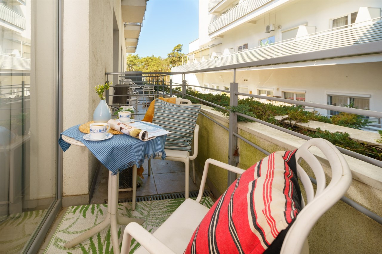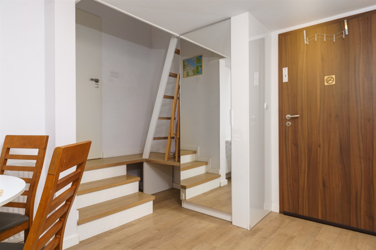 Funkcjonalne studio z antresolą zostało zaprojektowane z myślą o maksymalnym komforcie gości. Na antresoli znajduje się dwuosobowe łóżko oraz telewizor, natomiast w części dziennej – rozkładana sofa, stół z krzesłami oraz drugi telewizor. Lokal pomieści 4 osoby, co znacząco zwiększa jego potencjał najmu. Do dyspozycji jest również w pełni wyposażony aneks kuchenny (lodówka, płyta kuchenna, pochłaniacz i kuchenka mikrofalowa). Całość uzupełnia balkon z bocznym widokiem na morze.