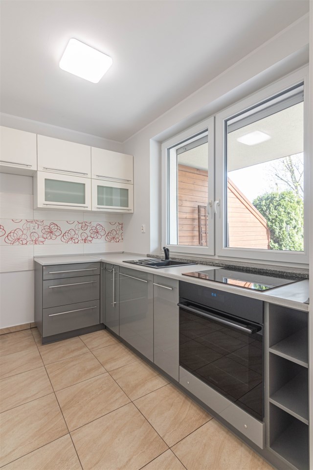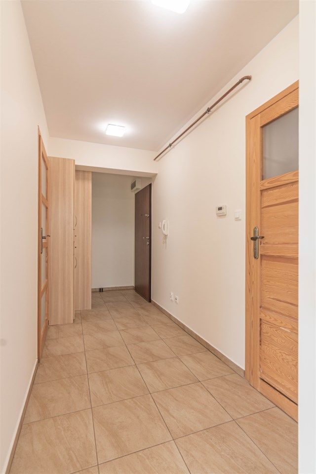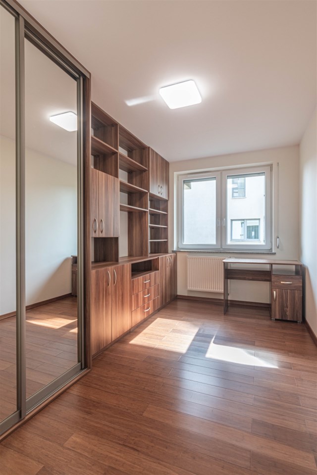 Mieszkanie w bardzo dobrym standardzie, po remoncie. Rozkład pomieszczeń: pokój dzienny z aneksem kuchennym, osobna sypialnia, łazienka z wc oraz korytarz. W pokojach na podłodze panele, w kuchni i korytarzu terakota. Ściany gładzone, malowane. Łazienka w glazurze i terakocie, kabina prysznicowa, meble łazienkowe, lustro. Kuchnia umeblowana i wyposażona - meble kuchenne, płyta indukcyjna, piekarnik elektryczny. W przedpokoju duża szafa w zabudowie