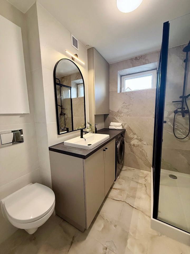 | Wyposażenie łazienki | kabina natryskowa, lustro, umywalka |