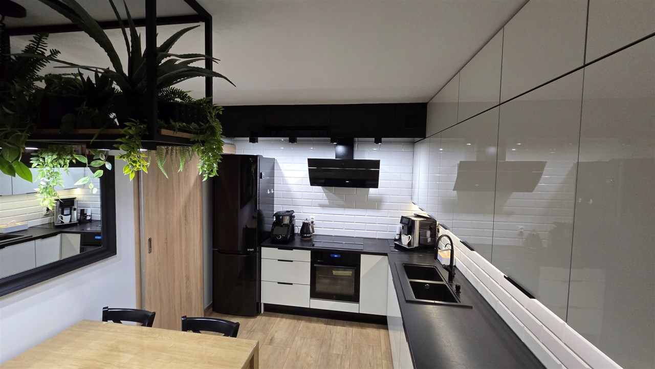 - oddzielnej kuchni (z pełnym nowoczesnym wyposażeniem w zmywarkę, piekarnik, płytę elektryczną, zabudowa na wymiar) istnieje możliwość otwarcia kuchni na salon