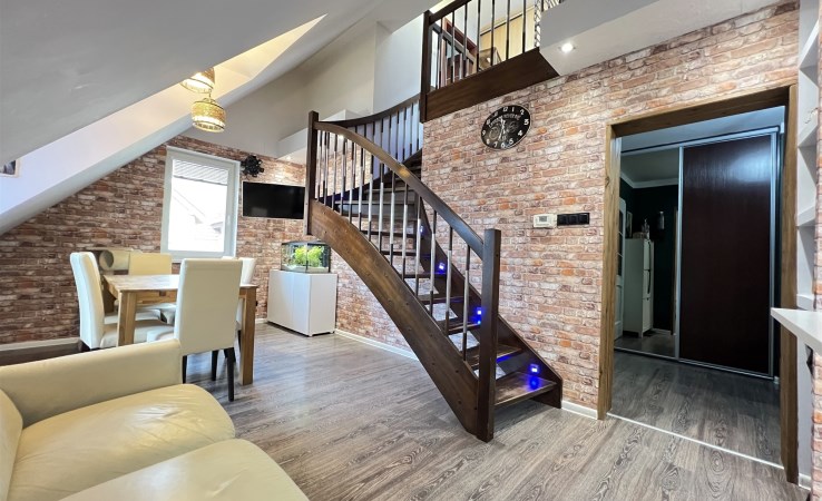Mieszkanie dwupoziomowe w domku wolnostojącym dwurodzinnym w Dąbiu bezczynszowe w okolicy plaży miejskiej. Mieszkanie znajduje się na pierwszym piętrze i poddaszu ; na niższym poziomie znajduja się trzy pokoje , kuchnia z jadalnią zabudowaną meblami na wymiar i wyposażoną , łazienka razem z wc . Poddasze zaadaptowane i wykończone - jeden duży otwarty salon z barem wyposażonym w media oraz łazienka razem z wc. Do części domu należy 300m2 ogrodu na którym stoją dwa garaże ; 70m2 murowany na dwa samochody i blaszany na jeden samochód . Do nieruchomości przynależy część podpiwniczenia w którym znajduje się piec gazowy . . Dom ocieplony w dobrym stanie technicznym , dachówka ceramiczna . Bardzo ciche i spokojne miejsce Dąbia Istnieje możliwość zakupu dodatkowo ok. 600m2 gruntu.