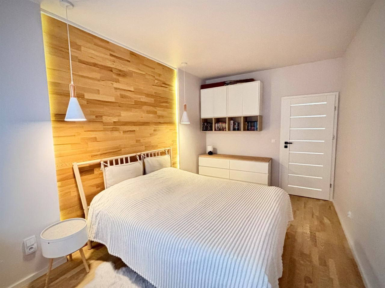 Sypialnia z łóżkiem o szerokości 160 cm, toaletką z lustrem i szafkami do przechowywania. Ma okno od strony północnej. Na podłodze deska drewniana trójwarstwowa.