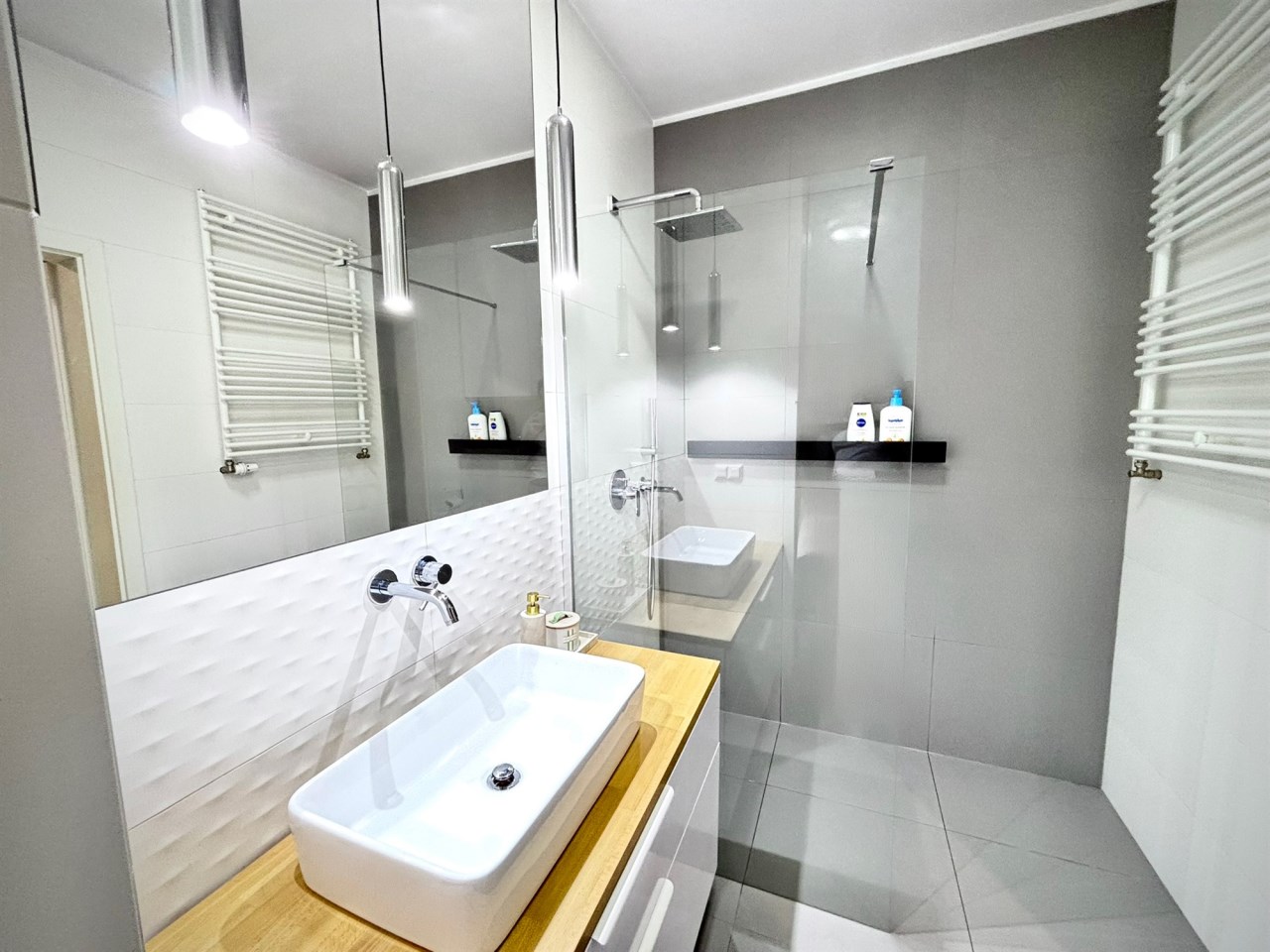 Łazienka z prysznicem typu walk in, wykończona dużymi płytkami. Prysznic jest bezbrodzikowy z odpływem liniowym, umywalka nablatowa. Dodatkowo duża szafka z szufladami pod umywalką oraz wc.