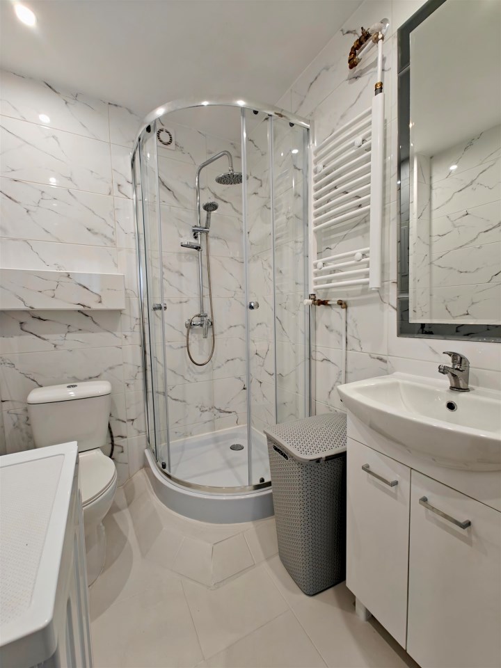 | Wyposażenie łazienki | kabina prysznicowa, pralka, umywalka na szafce, WC |