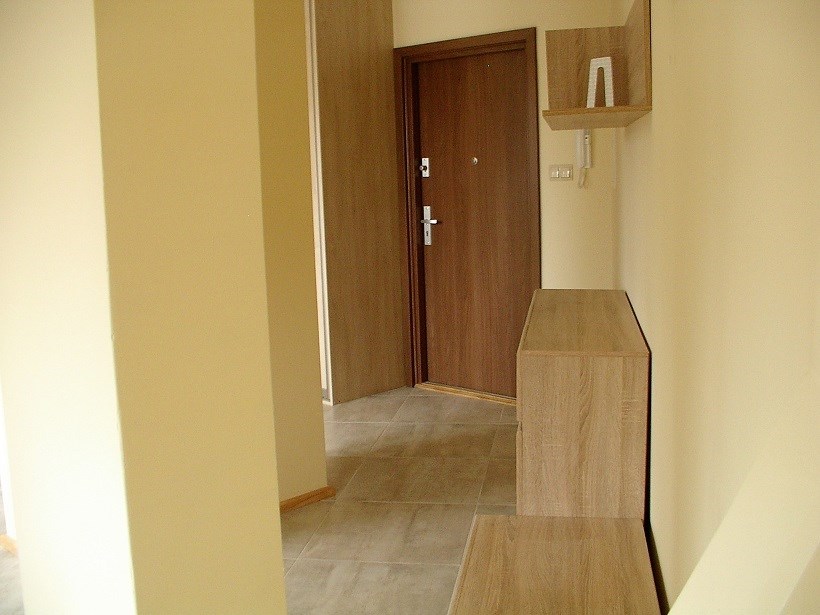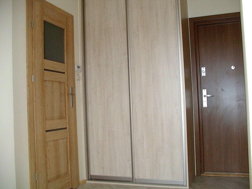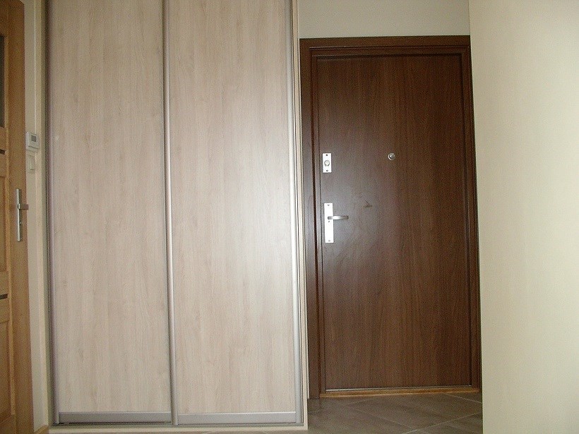 Łazienka z kabiną natryskową sedesem, umywalką, pralką. Kuchnia wyposażona w zabudowę na wymiar i sprzęt AGD w zabudowie. W pokoju kanapa rozkładana i szafki. W przedpokoju szafa w zabudowie. Drzwi antywłamaniowe, ogrzewanie gazowe z pieca dwuobiegowego. Podłogi są w całym mieszkaniu z terakoty.