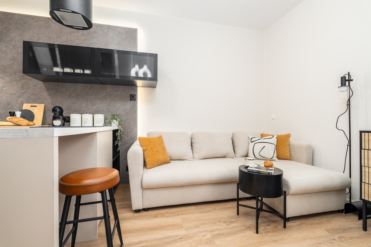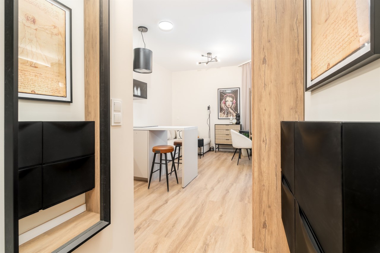 Mieszkanie po remoncie kapitalnym, o południowej ekspozycji okien. Pokój dzienny z aneksem kuchennym, łazienka i korytarz. W pokoju i korytarzu na podłodze panele, ściany wygładzone, malowane. W pokoju wypoczynek, stolik kawowy, biurko, krzesło, komoda, stolik RTV, duża szafa ubraniowa i szafka na buty. Łazienka w glazurze i terakocie, kabina prysznicowa, muszla podwieszana typu geberit, umywalka, meble łazienkowe, lustro, pralka. Kuchnia kompletnie umeblowana i wyposażona: barek, dwa stołki barowe, duża lodówka z zamrażalnikiem, lodówka, płyta elektryczna, okap, zmywarka, mikrofala.