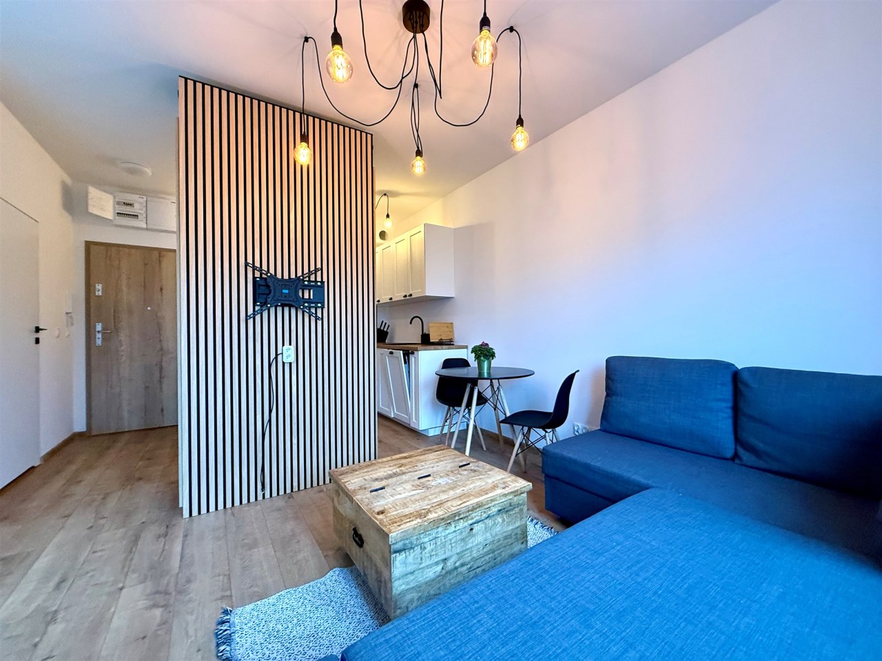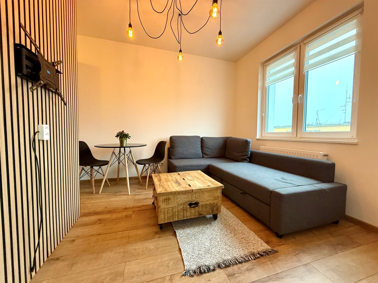 - salon (rozkładana sofa, stół z krzesłami), wydzielona przestrzeń do wykorzystania na miejsce do pracy/nauki lub wygospodarowanie kącika do spania