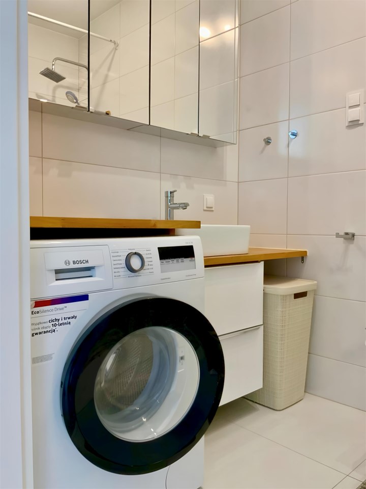| Wyposażenie łazienki | kabina prysznicowa, lustro, pralka, umywalka, WC, zabudowa łazienkowa |