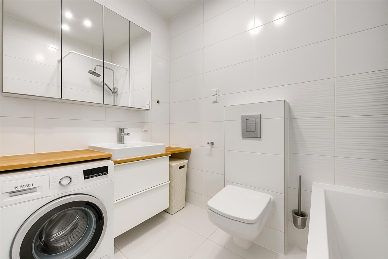 Łazienka: wanna, pralka, eleganckie kafle i armatura wysokiej klasy.