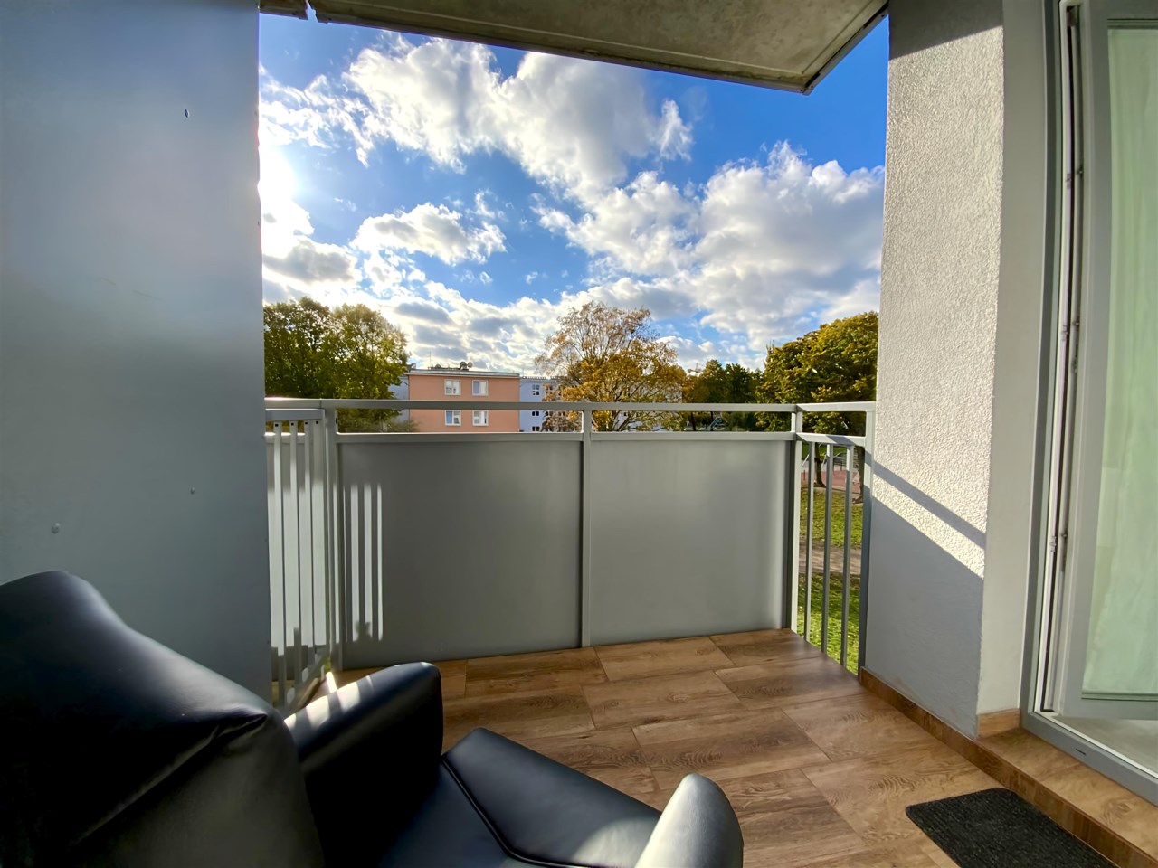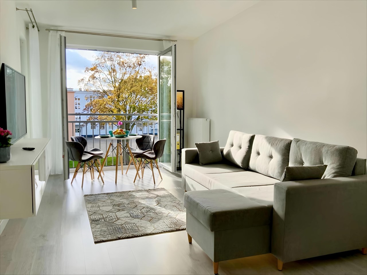 Salon: rozkładana sofa, telewizor, wyjście na balkon z widokiem na zadbane podwórze,