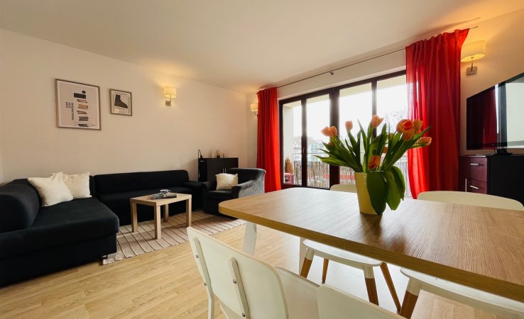 - salon z aneksem kuchennym, łóżkiem oraz wyjściem na balkon,