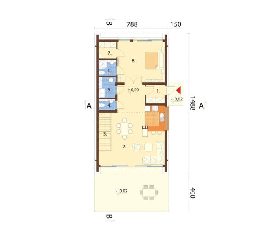 Z salonu można wyjść na taras i ogród, a także przejść na antresolę. Obok schodów na poddasze jest WC, a za nim pomieszczenie w którym jest kotłownia i pralnia. Ponadto wiatrołap, sypialnia z prywatną łazienką i garderobą.
