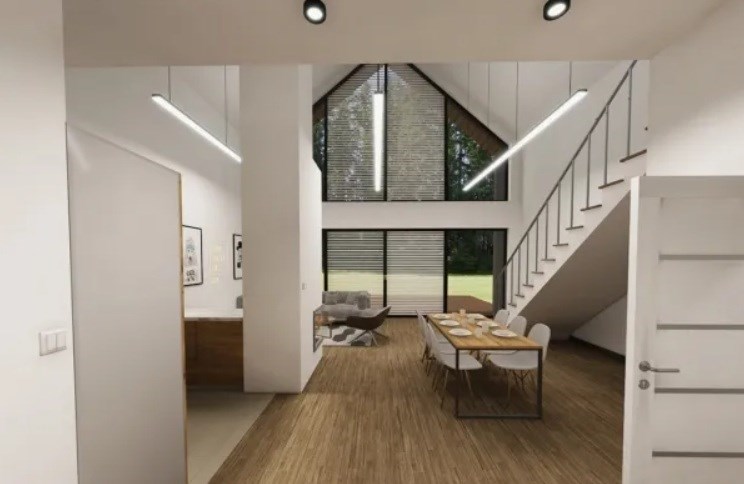 Ergonomiczny dom, zaprojektowany z myślą o praktycznych aspektach użytkowania, utrzymany w stylistyce nowoczesnej stodoły. Posiada duże przeszklenia w elewacjach bocznych, co sprawia że jest bardzo słoneczny i przytulny. Przeszklenia wraz z tarasem i ogrodem od strony południowo-zachodniej, widok na pola i lasy dzięki braku sąsiadujących działek budowlanych, dla osób ceniących prywatność.