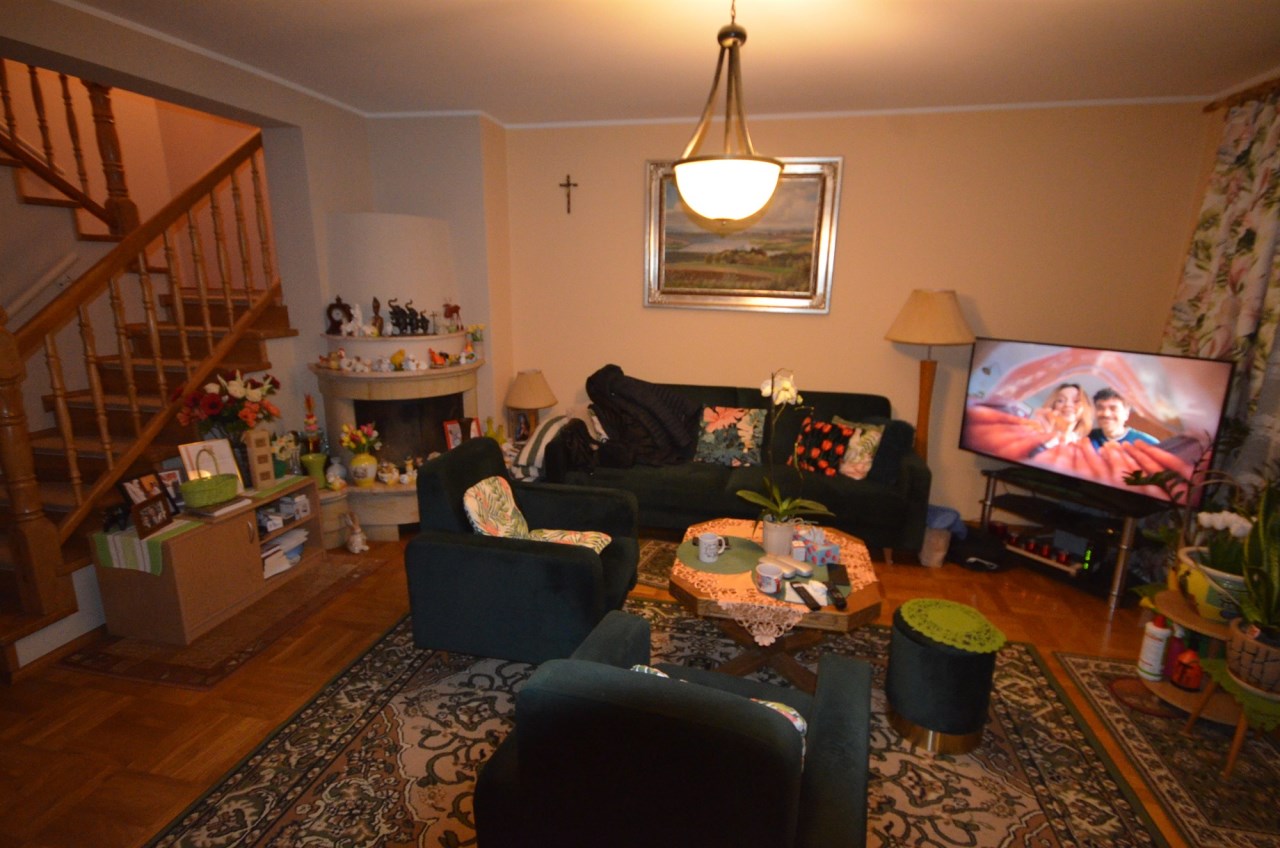 Na parterze salon z kominkiem i wyjściem na taras i do zagospodarowanego ogrodka ,otwarta kuchnia oraz łazienka z wc, przejście do długiego garażu.