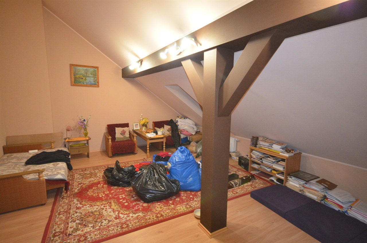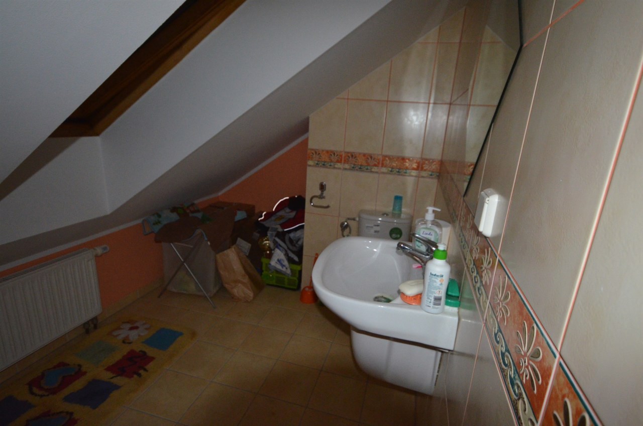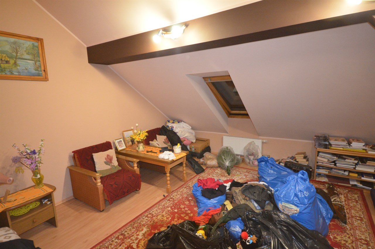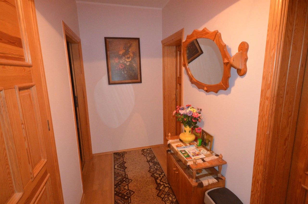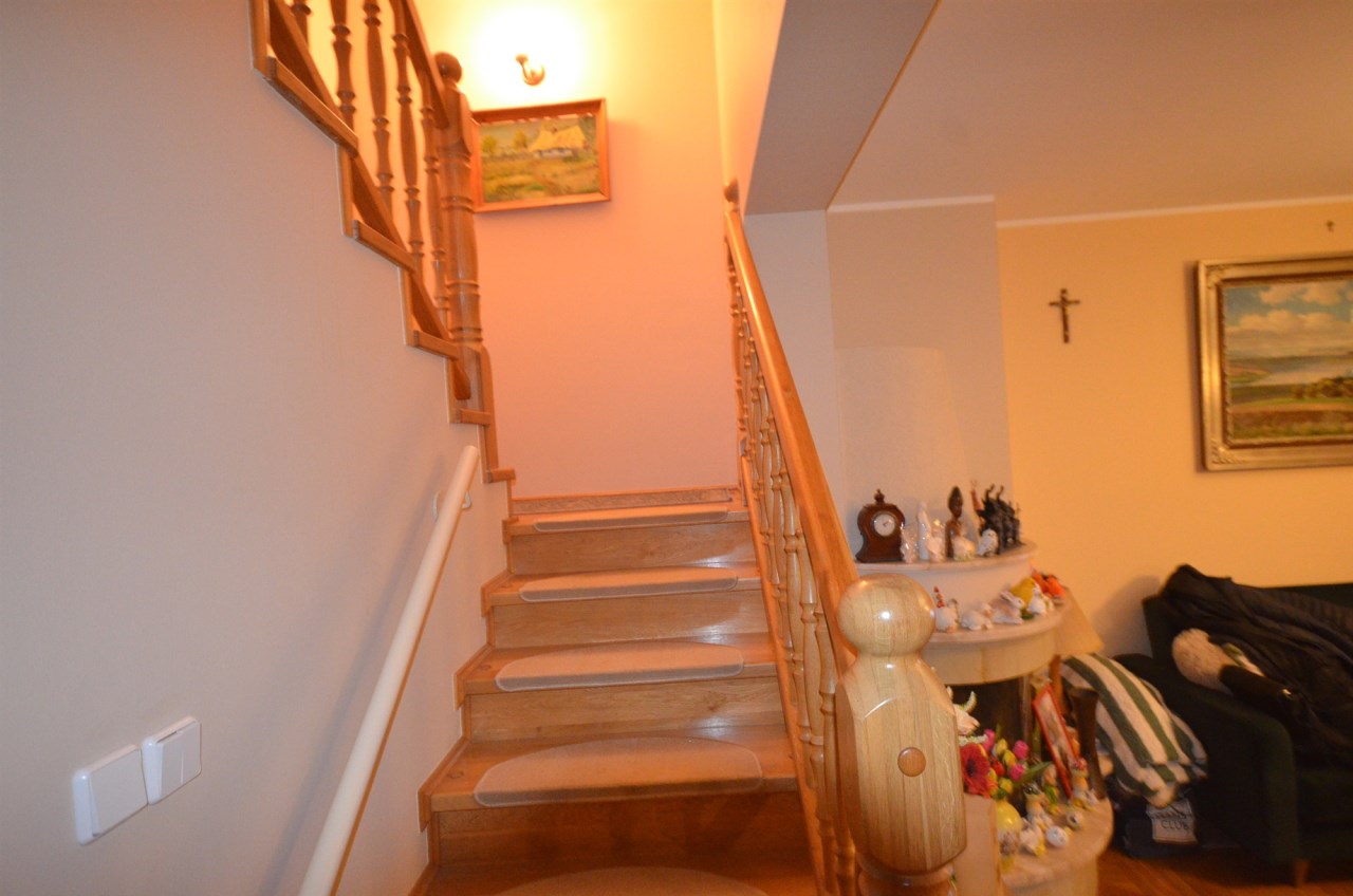 Na pierwszym piętrze znajdują się 3 pokoje, łazienka z wc i wanną. Na poddasze prowadzą również drewniane schody i jest tam zagospodarowany pokój, łazienka z wc oraz duży otwarty pokój z widokiem na ogród. Nieruchomość w pełni umeblowana w standardzie powyżej średniej, po remoncie 3 lata temu