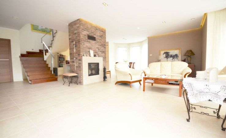 Duży przestronny dom z tarasem, garażem dwustanowiskowym w bryle budynku posadowiony na działce o powierzchni 880 m2. Nieruchomość znajduje się w prestiżowej dzielnicy z pięknym widokiem na panoramę miasta. Parter domu to hol, z którego wchodzimy do dużego pokoju z aneksem kuchennym, kominkiem, tarasem i widokiem na ogród. Poza tym na parterze znajdują się : łazienka w stonowanych odcieniach beżowych, wc, dwa pokoje do własnej aranżacji jako sypialnie lub gabinet czy też biblioteka domowa oraz kotłownia i garaż. Na piętrze znajdują się trzy sypialnie ( dwa z nich posiadają balkony), łazienka i pomieszczenie na saunę. Poza tym z piętra wejście na strych około 10m2. Okna w całym domu drewniane, wyposażone w zewnętrzne rolety, podłogi drewniane, schody z drewna egzotycznego. Elewacja wykonana z tynku ceramicznego, taras, podjazd i ogrodzenie z cegły klinkierowej. Ogrzewanie w domu piecem gazowym, w łazienkach i kuchni dodatkowo ogrzewanie podłogowe oraz kominkiem z płaszczem wodnym. Dom wykonany z materiałów wysokiej jakości, bardzo funkcjonalny.