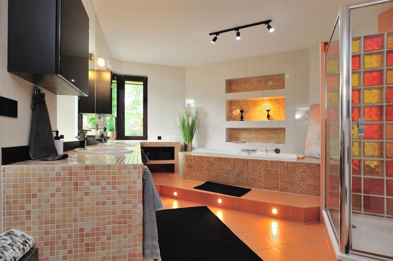 komfortowy salon kąpielowy z wanną, prysznicem i WC,