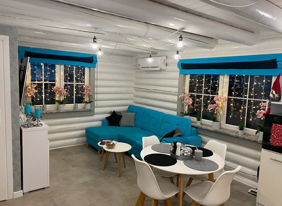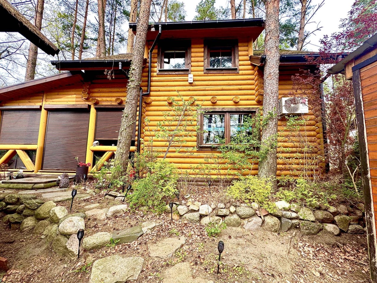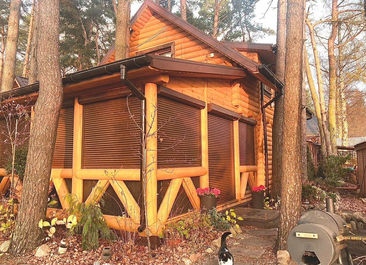 Dom wykonany z naturalnego bala drewnianego tworzy niepowtarzalny klimat – ciepły, przytulny i harmonijnie wpisujący się w otoczenie lasów i jeziora. Duże przeszklenia zapewniają doskonałe doświetlenie wnętrza i widok na zieleń.