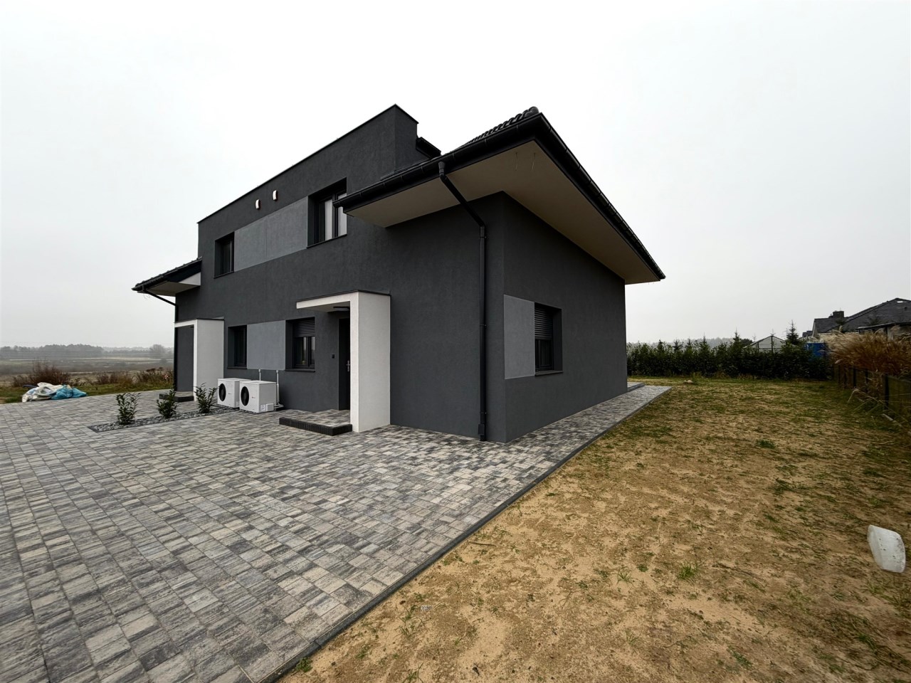 Ocieplenie - styropian grafitowy 20 cm, dachówka ceramiczna Roben, pompa ciepła, dach ocieplony pianą PUR, poddasze podłoga w OSB, sufity na górze wykończone w płytach gk, założone kontakty i włączniki w kolorze białym, rolety zewnętrzne, w pełni wykończona kotłownia w gresie, wykonane gładzie, położony polbruk, zrobione tarasy i podjazdy.