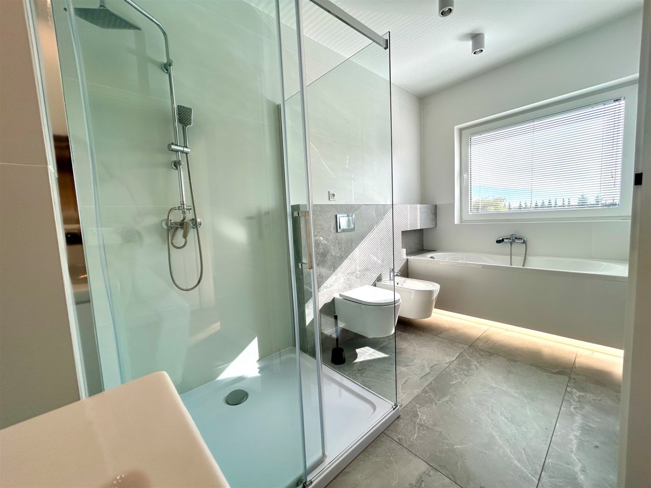 Piętro: trzy sypialnie, garderoba, przestronna łazienka z wanną i prysznicem.