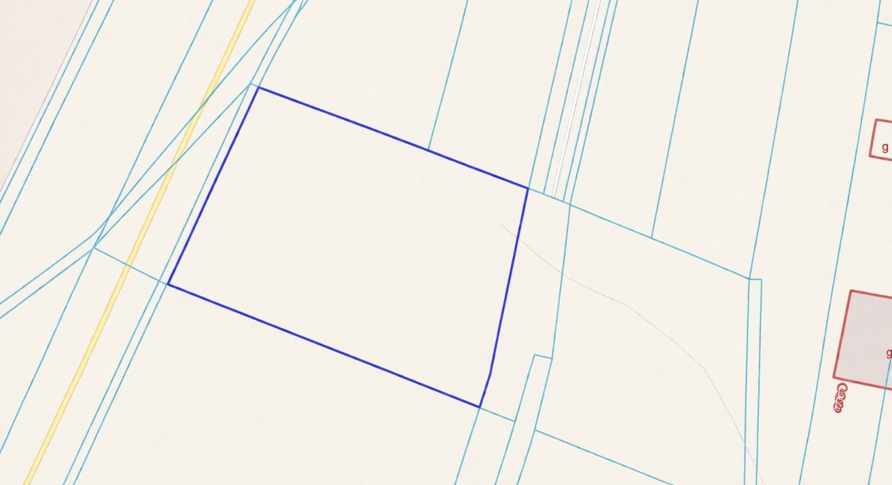 Działka o powierzchni 5198 m2 bezpośrednio przylega do dwóch dróg (wewnętrznej i krajowej). W równym kształcie prostokąta, płaska.