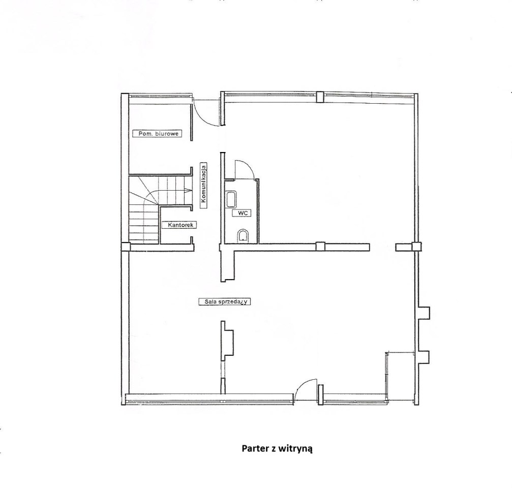 Parter: sala główna z witryną, magazyn, biuro, kantorek oraz wc. Łączna powierzchnia parteru 97,65 m2.