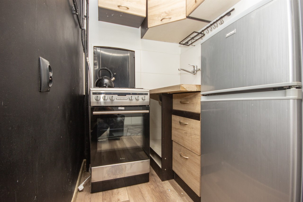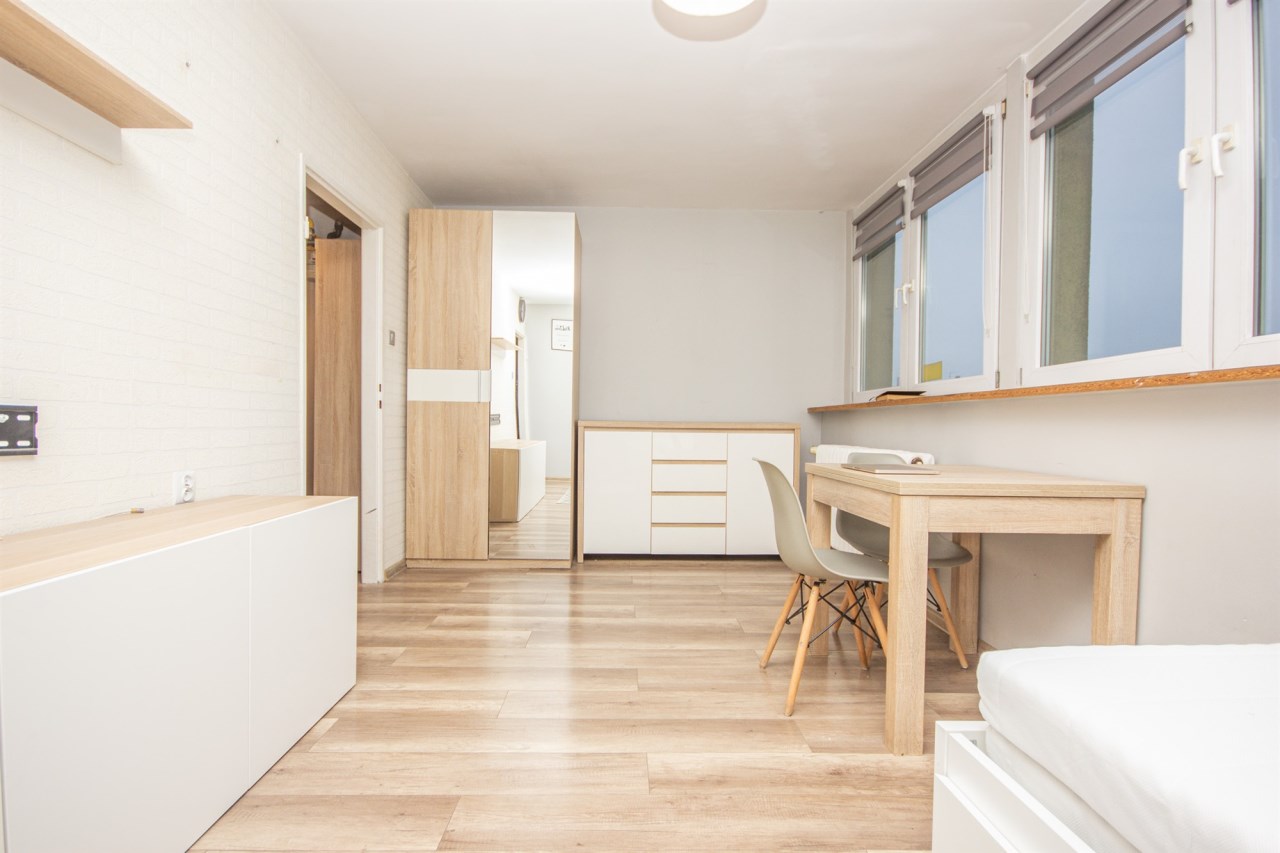 - jednego pokoju z duża szafą, łóżkiem i miejscem do jedzenia