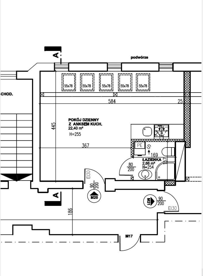 - pokój dzienny z aneksem kuchennym 22,40 m2,
