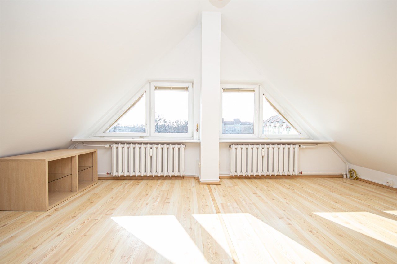 świeżo wymienione okna połaciowe, budynek po remoncie dachu z zadbaną klatką schodową.